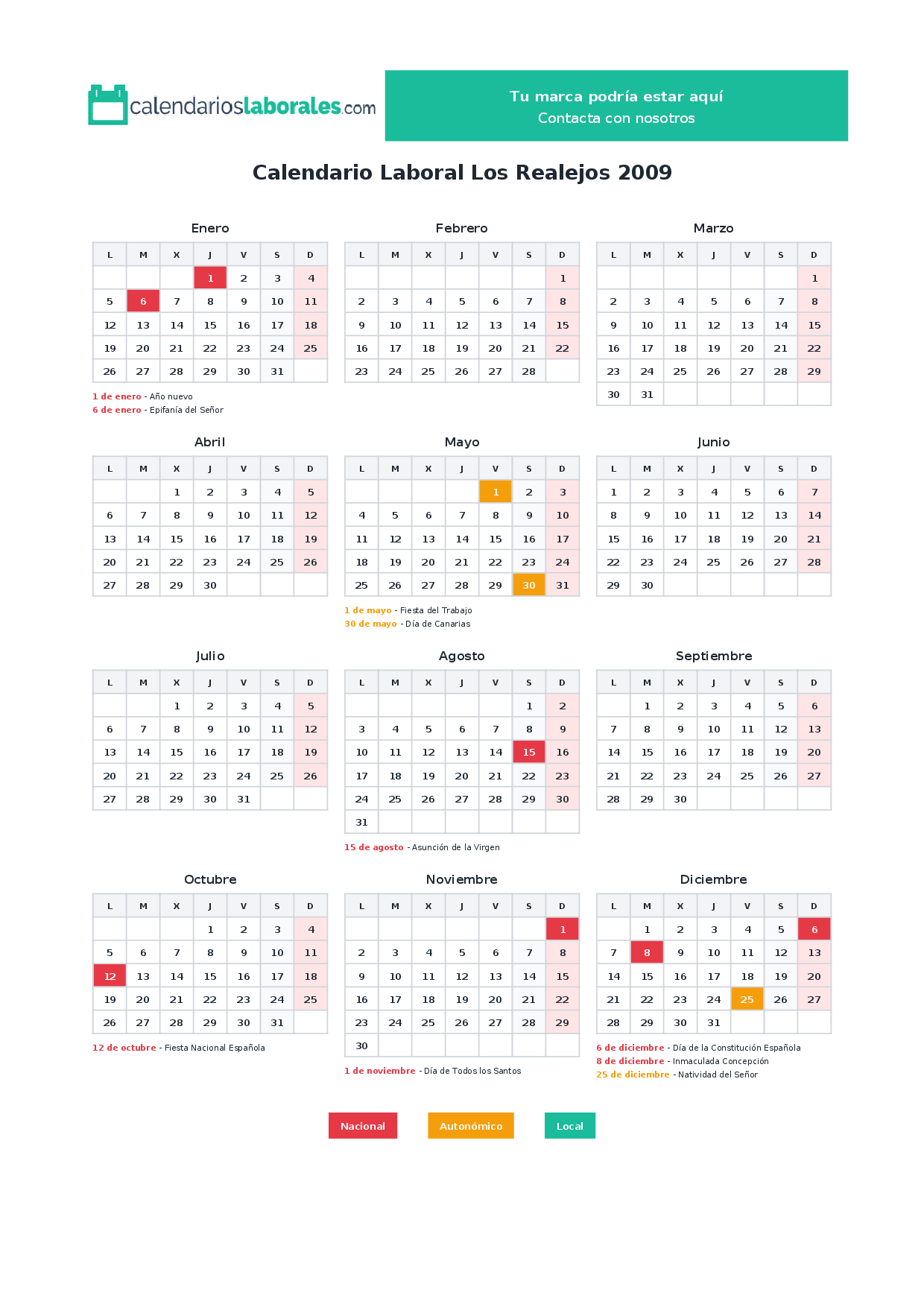 En 2009, 7 festivos nacionales se celebran en todo el territorio español, incluidos en el calendario laboral de Los Realejos.