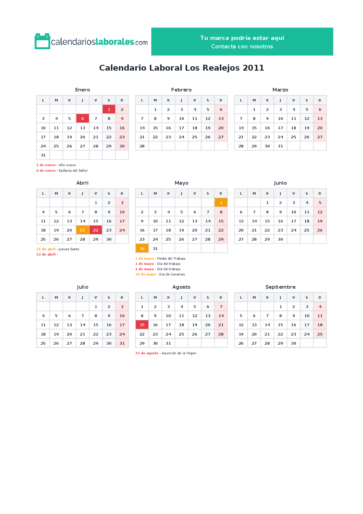 El calendario laboral de Los Realejos en 2011 incluye un total de 12 días festivos, que combinan festivos nacionales, festivos autonómicos de Canarias y los festivos locales propios del municipio.