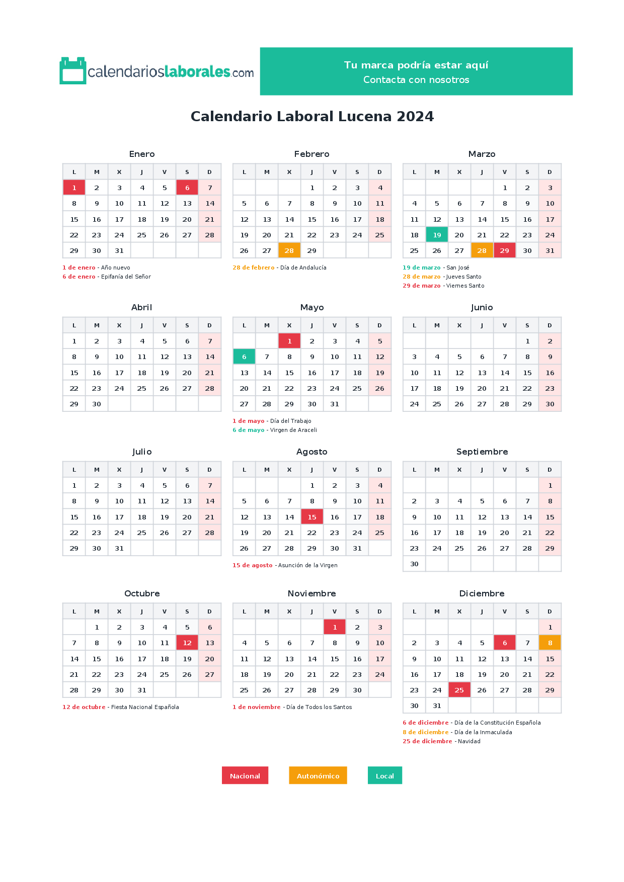 El calendario laboral de Lucena en 2024 incluye un total de 14 días festivos, que combinan festivos nacionales, festivos autonómicos de Andalucía y los festivos locales propios del municipio.
