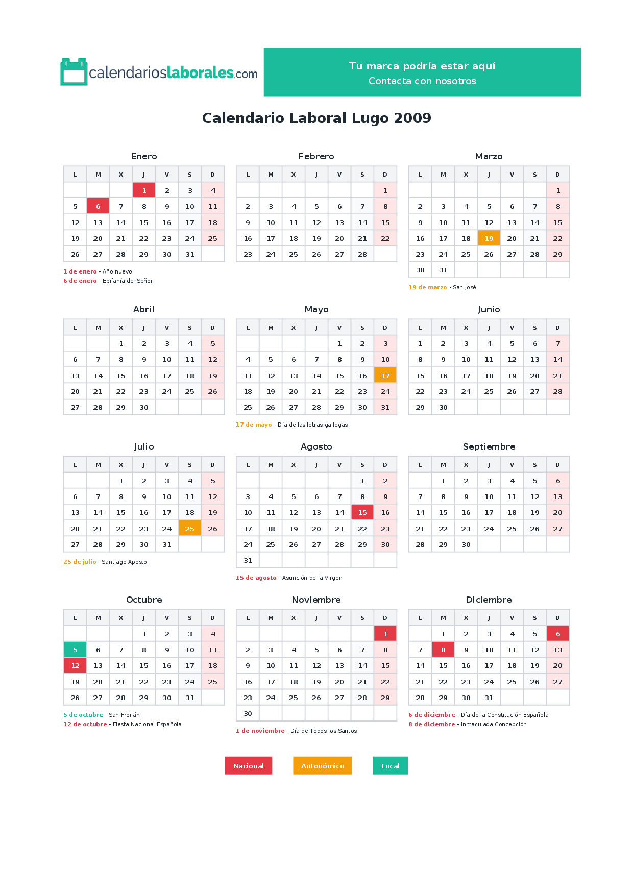 El calendario laboral de Lugo en 2009 cuenta con un total de 11 días festivos, que incluyen festivos nacionales, festivos autonómicos de Galicia y los festivos locales establecidos por cada municipio.
