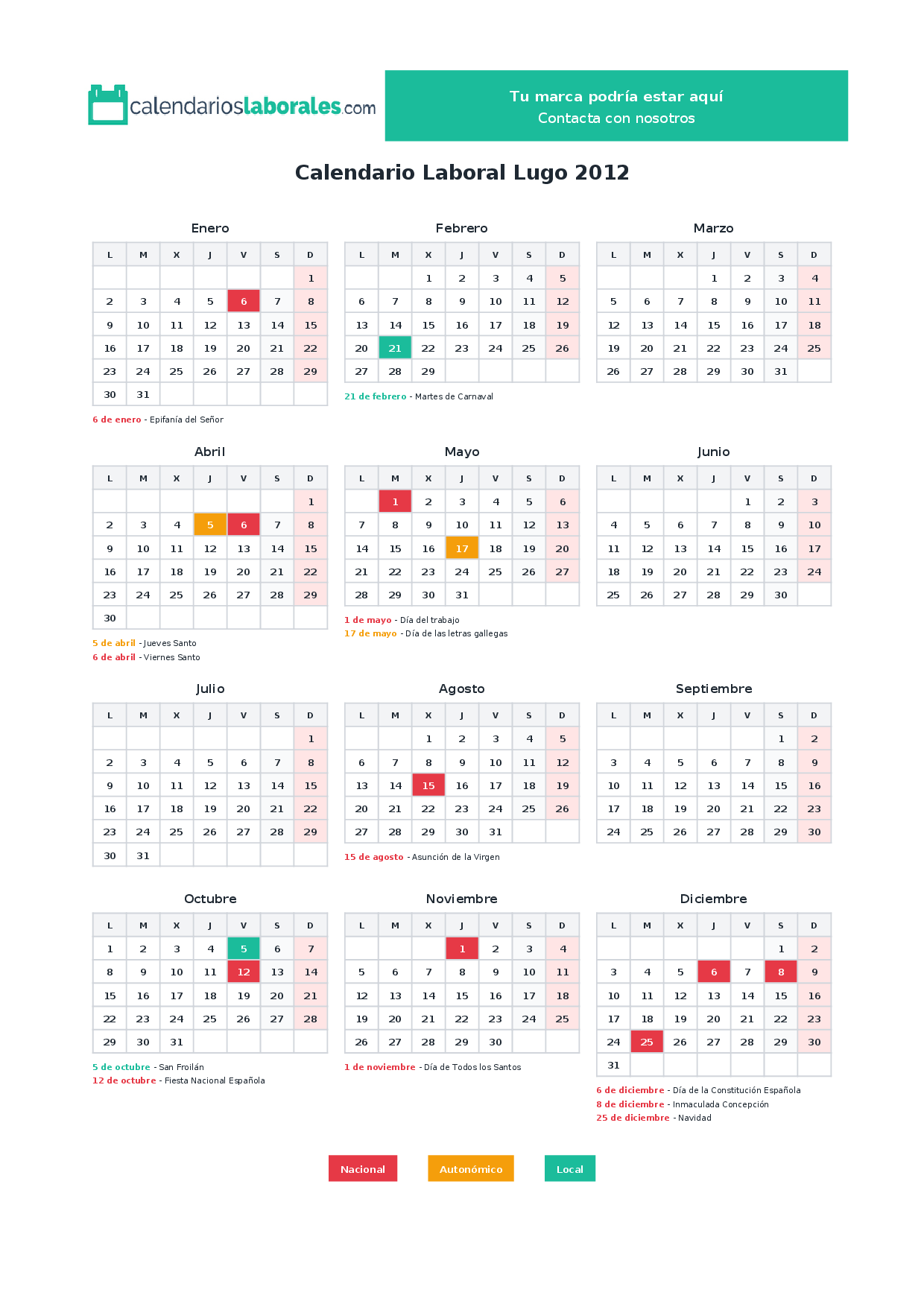 El calendario laboral de Lugo en 2012 cuenta con un total de 13 días festivos, que incluyen festivos nacionales, festivos autonómicos de Galicia y los festivos locales establecidos por cada municipio.