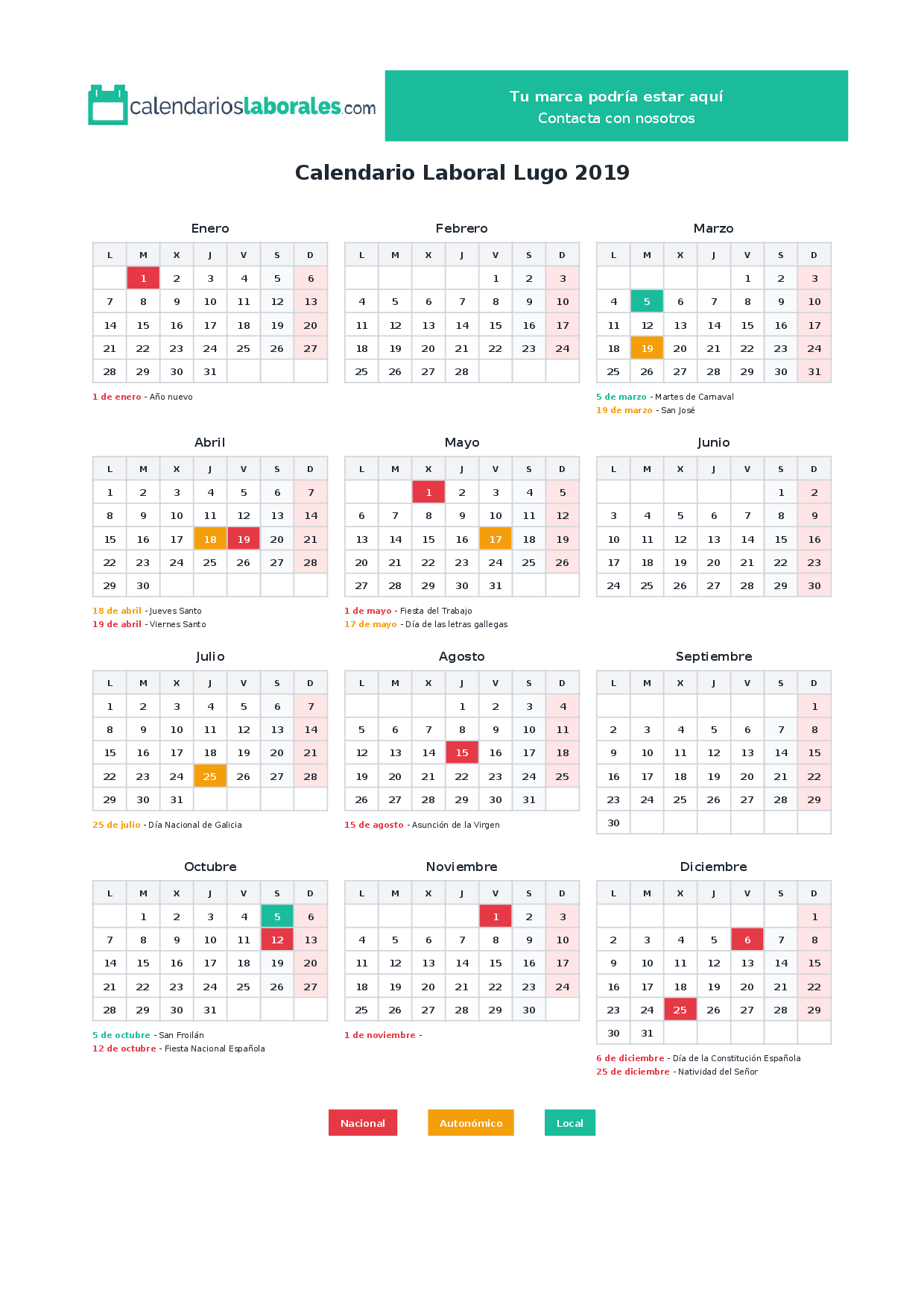 El calendario laboral de Lugo en 2019 cuenta con un total de 14 días festivos, que incluyen festivos nacionales, festivos autonómicos de Galicia y los festivos locales establecidos por cada municipio.