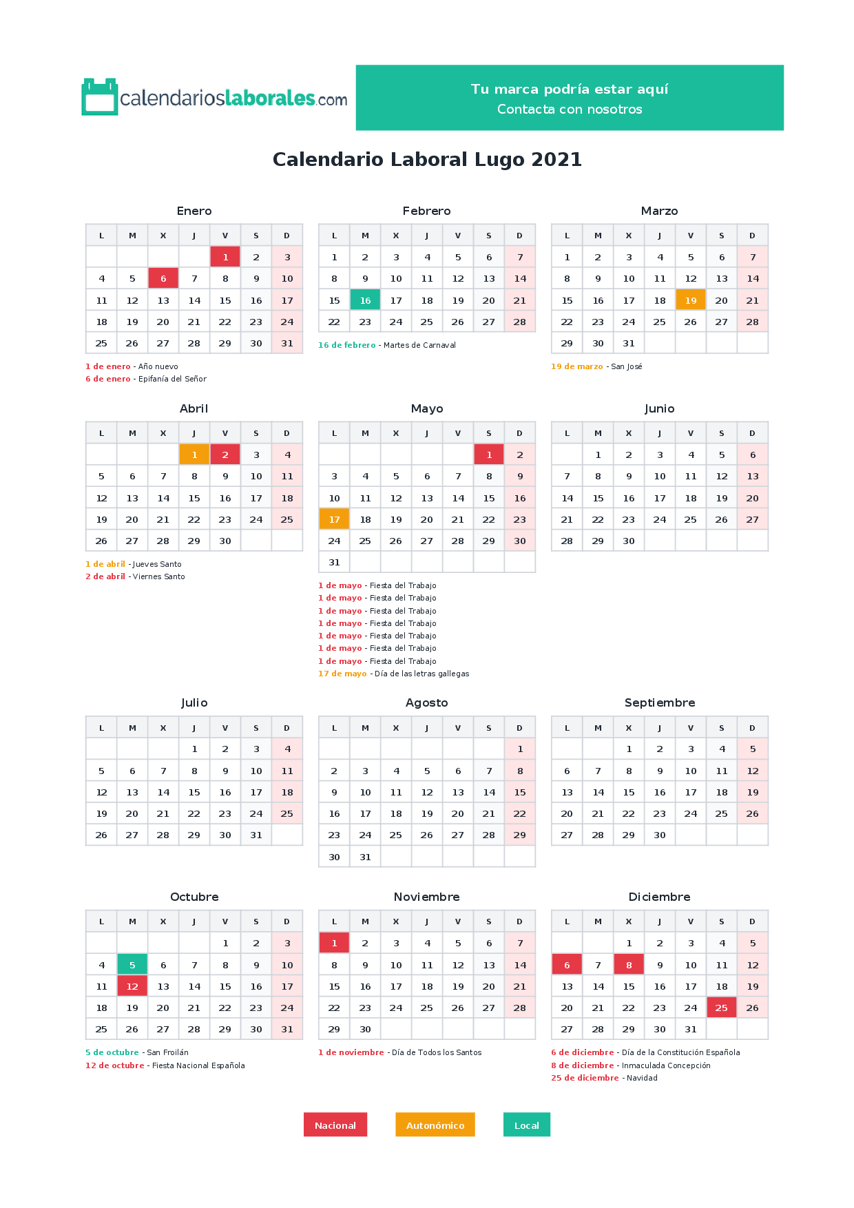 El calendario laboral de Lugo en 2021 cuenta con un total de 14 días festivos, que incluyen festivos nacionales, festivos autonómicos de Galicia y los festivos locales establecidos por cada municipio.