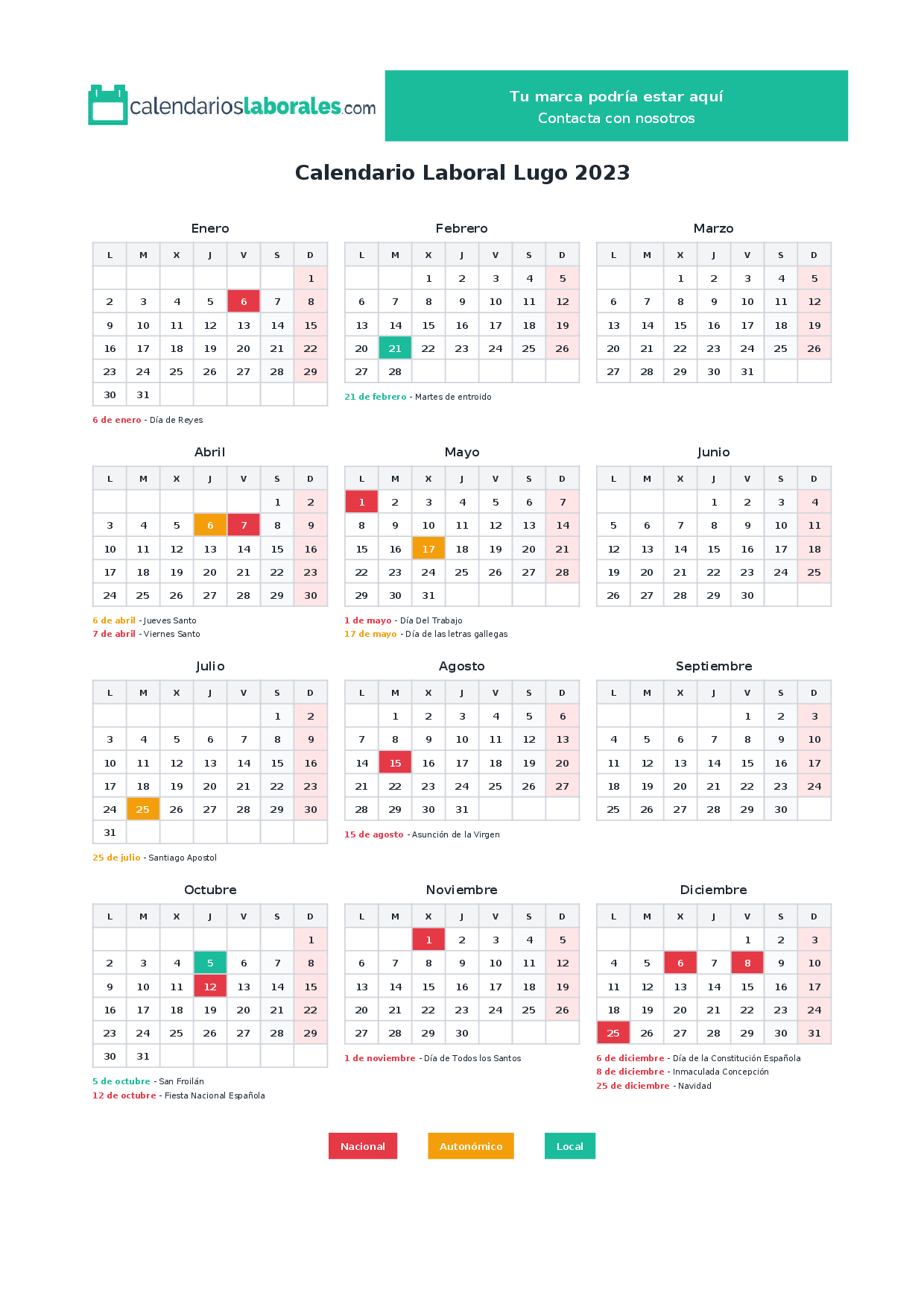 El calendario laboral de Lugo en 2023 cuenta con un total de 14 días festivos, que incluyen festivos nacionales, festivos autonómicos de Galicia y los festivos locales establecidos por cada municipio.