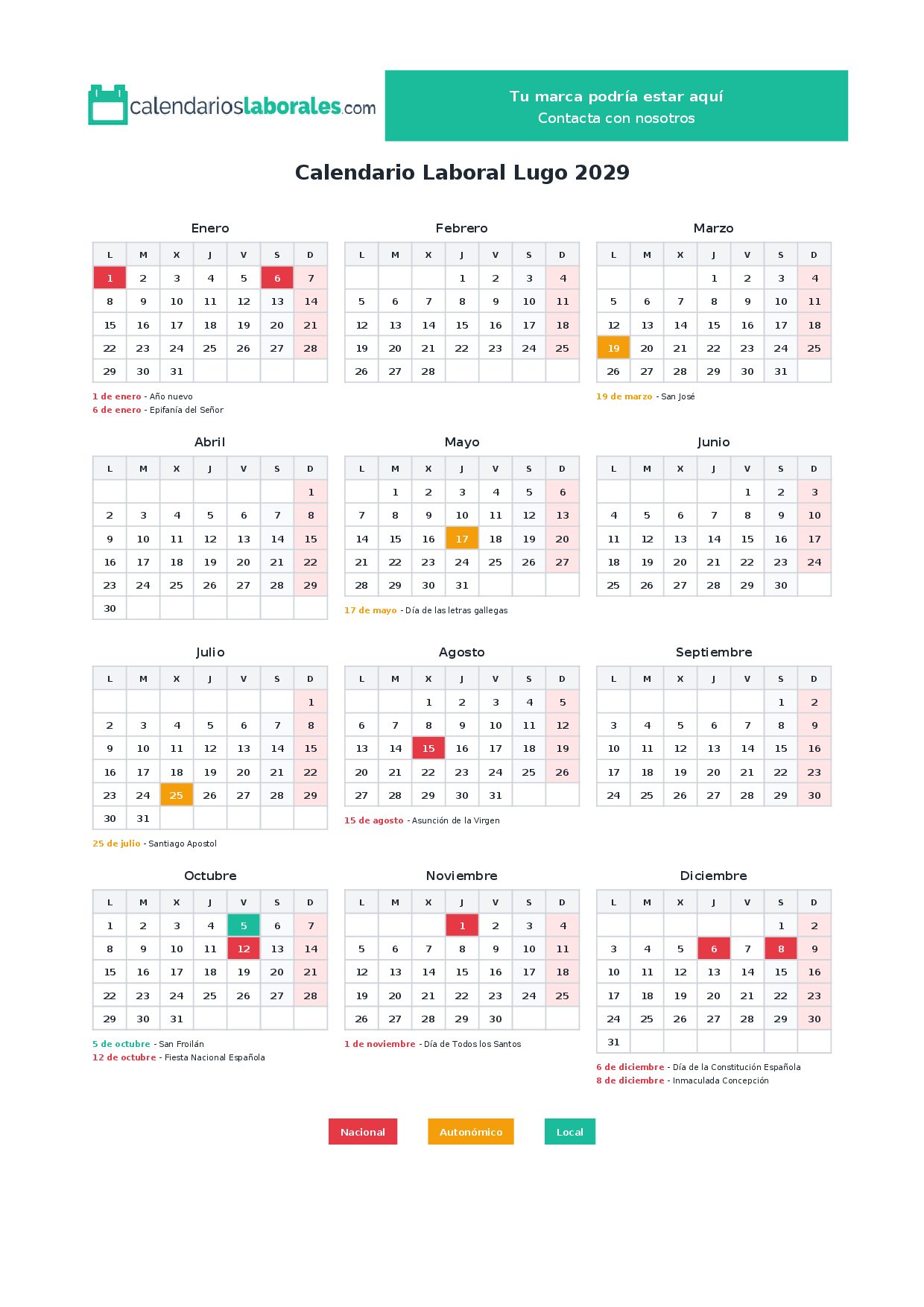 El calendario laboral de Lugo en 2029 cuenta con un total de 11 días festivos, que incluyen festivos nacionales, festivos autonómicos de Galicia y los festivos locales establecidos por cada municipio.