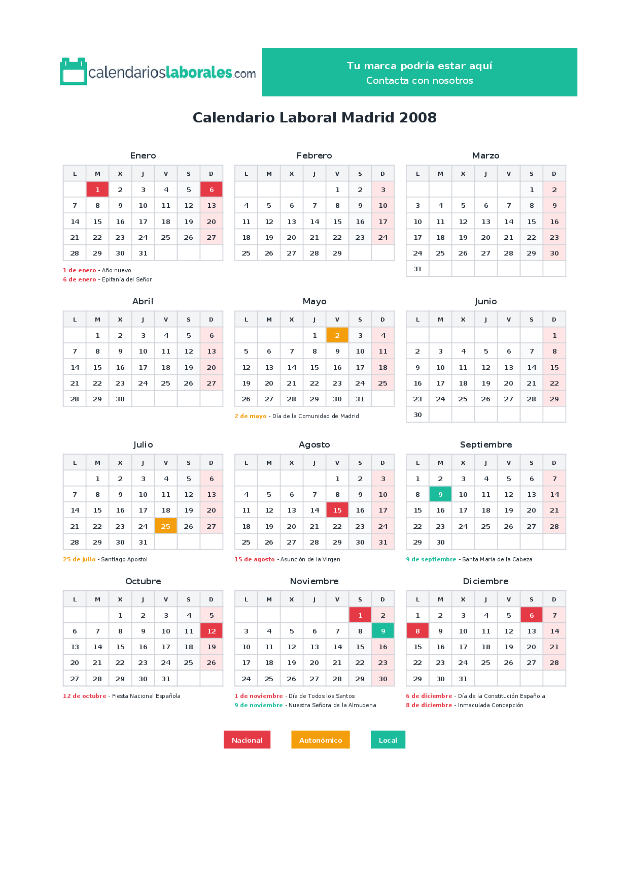 Puedes consultar también el calendario laboral completo de Comunidad de Madrid 2008 o el calendario laboral de España para conocer el detalle nacional.