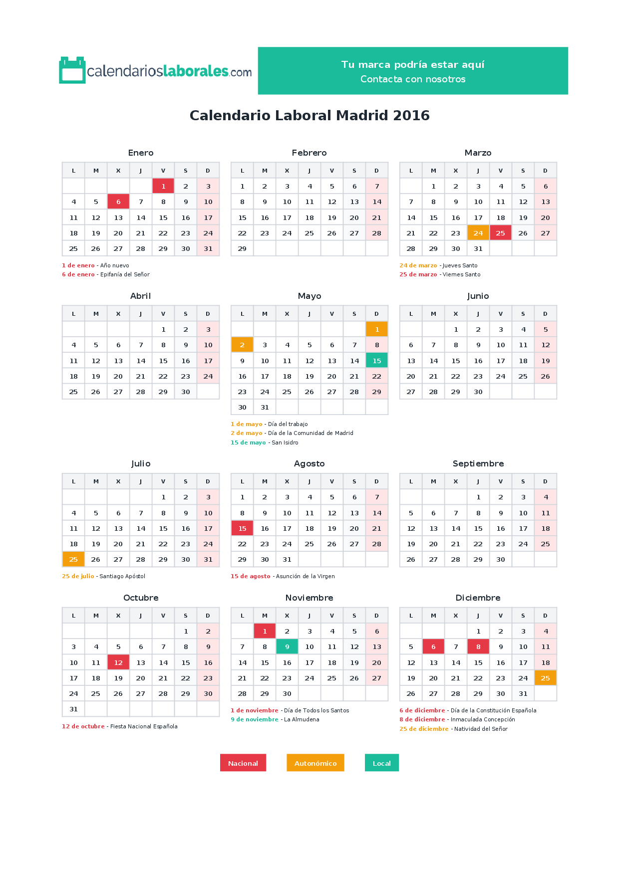 El calendario laboral de Madrid en 2016 cuenta con un total de 15 días festivos, que incluyen festivos nacionales, festivos autonómicos de Comunidad de Madrid y los festivos locales establecidos por cada municipio.