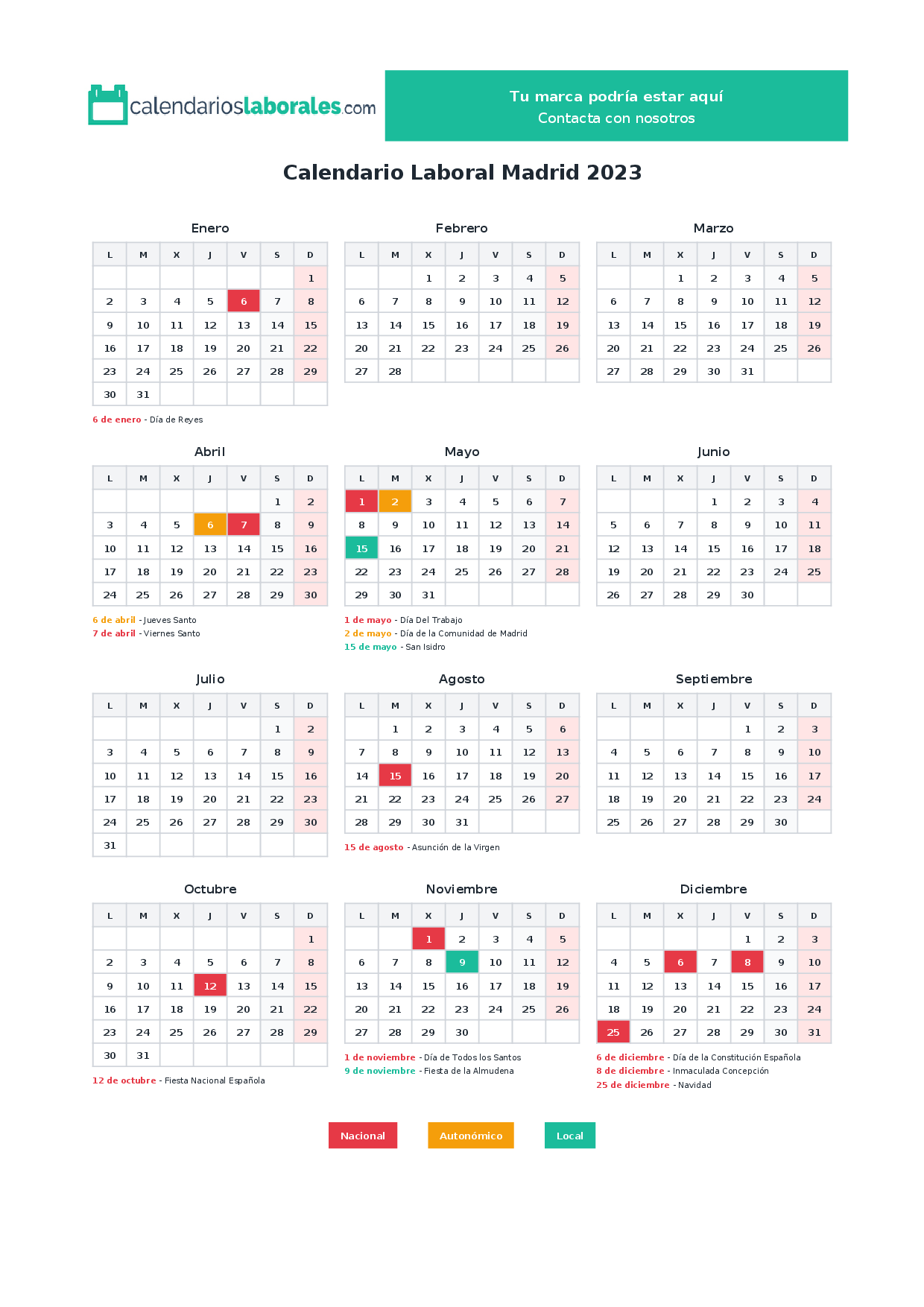 El calendario laboral de Madrid en 2023 cuenta con un total de 13 días festivos, que incluyen festivos nacionales, festivos autonómicos de Comunidad de Madrid y los festivos locales establecidos por cada municipio.
