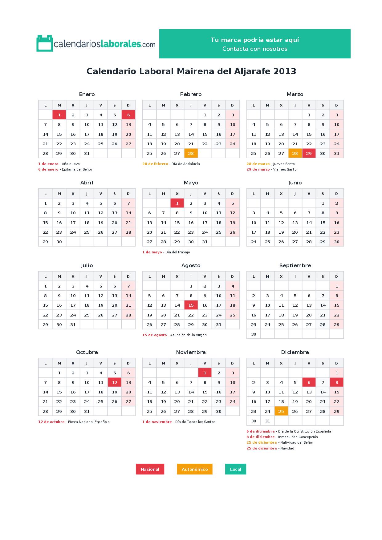 En 2013, 10 festivos nacionales se celebran en todo el territorio español, incluidos en el calendario laboral de Mairena del Aljarafe.
