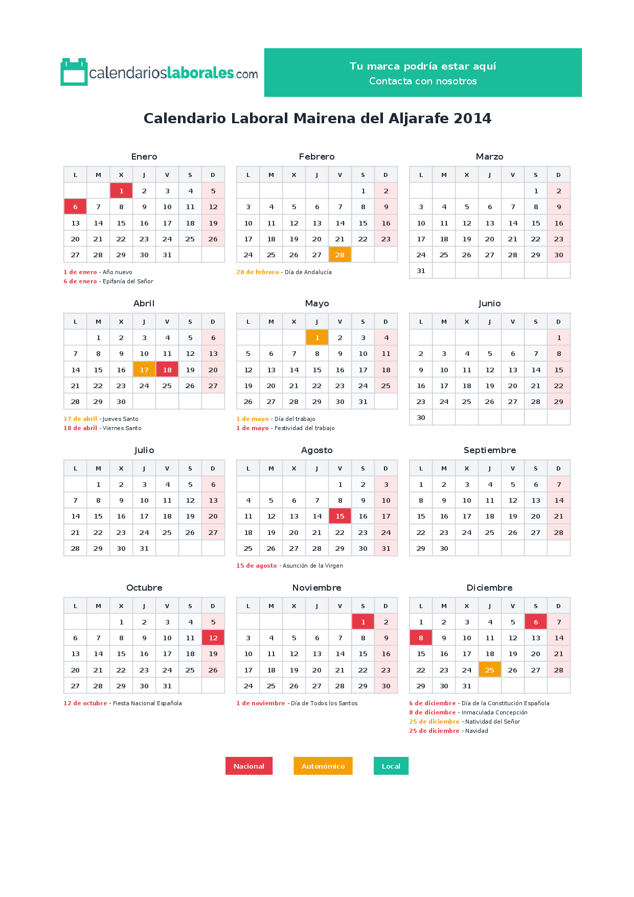 En 2014, 10 festivos nacionales se celebran en todo el territorio español, incluidos en el calendario laboral de Mairena del Aljarafe.