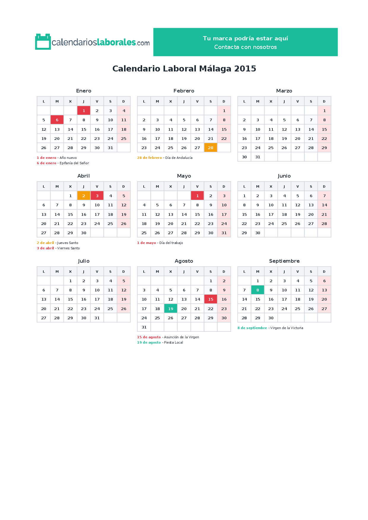 El calendario laboral de Málaga en 2015 cuenta con un total de 14 días festivos, que incluyen festivos nacionales, festivos autonómicos de Andalucía y los festivos locales establecidos por cada municipio.