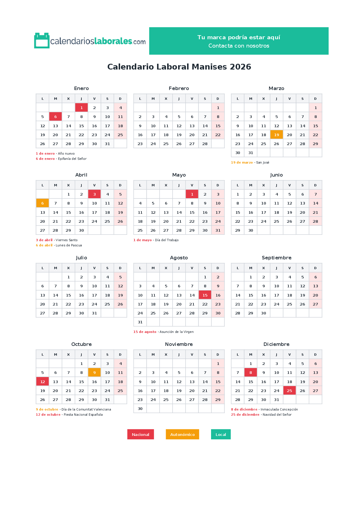 En 2026, 8 festivos nacionales se celebran en todo el territorio español, incluidos en el calendario laboral de Manises.