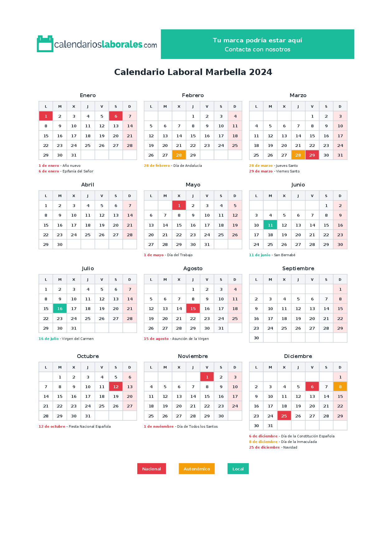 El calendario laboral de Marbella en 2024 incluye un total de 14 días festivos, que combinan festivos nacionales, festivos autonómicos de Andalucía y los festivos locales propios del municipio.