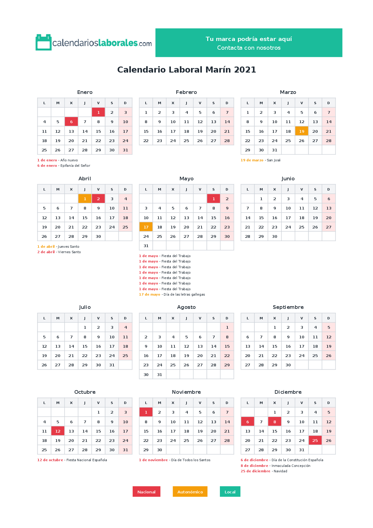 El calendario laboral de Marín en 2021 incluye un total de 12 días festivos, que combinan festivos nacionales, festivos autonómicos de Galicia y los festivos locales propios del municipio.
