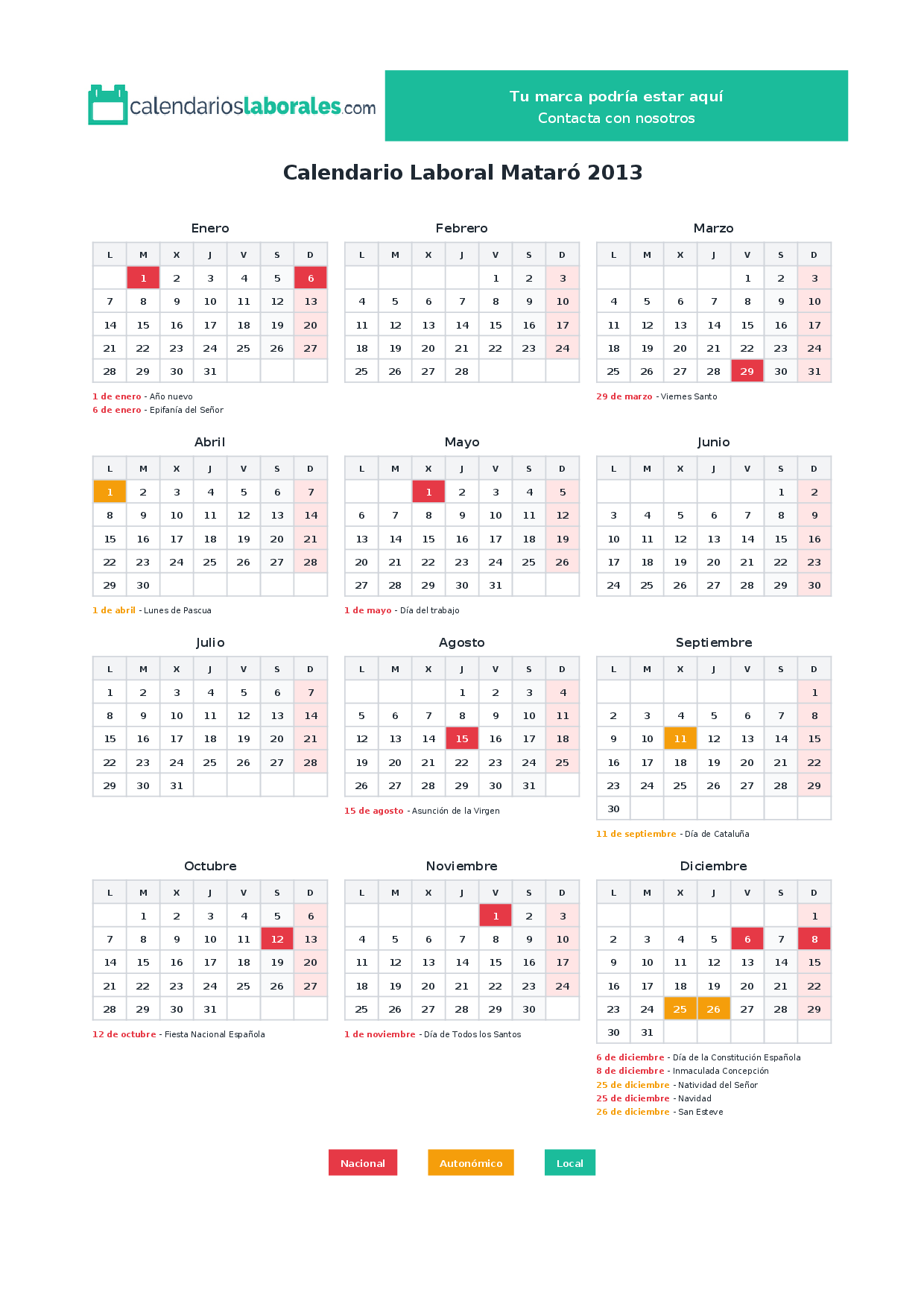 Calendario laboral Mataró 2013