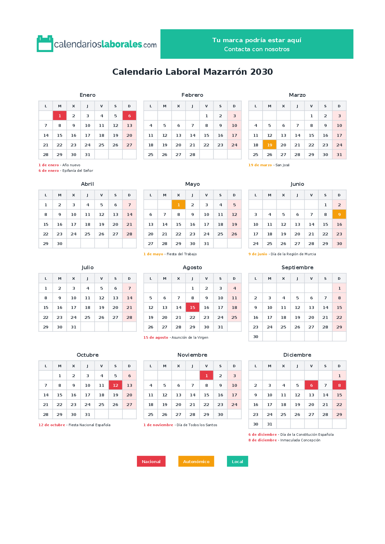 El calendario laboral de Mazarrón en 2030 incluye un total de 10 días festivos, que combinan festivos nacionales, festivos autonómicos de Murcia y los festivos locales propios del municipio.