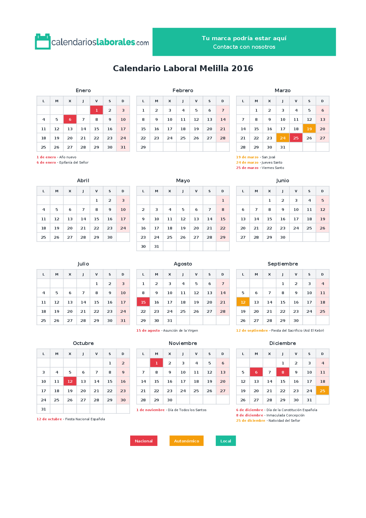 El calendario laboral de Melilla en 2016 incluye un total de 12 días festivos, que combinan festivos nacionales y festivos autonómicos establecidos por la comunidad autónoma.
