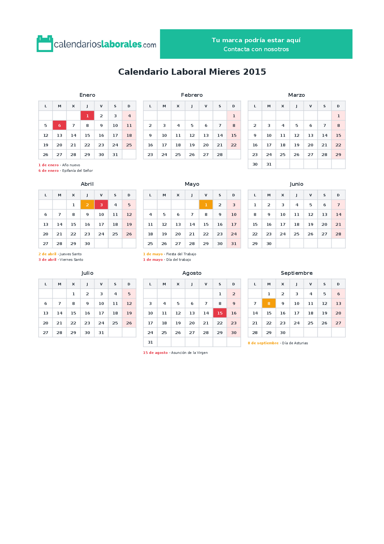 En 2015, 20 festivos nacionales se celebran en todo el territorio español, incluidos en el calendario laboral de Mieres.