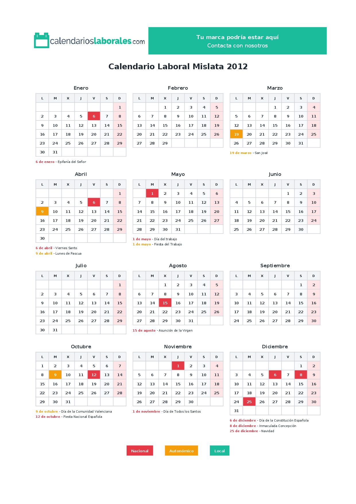 El calendario laboral de Mislata en 2012 incluye un total de 12 días festivos, que combinan festivos nacionales, festivos autonómicos de Comunidad Valenciana y los festivos locales propios del municipio.