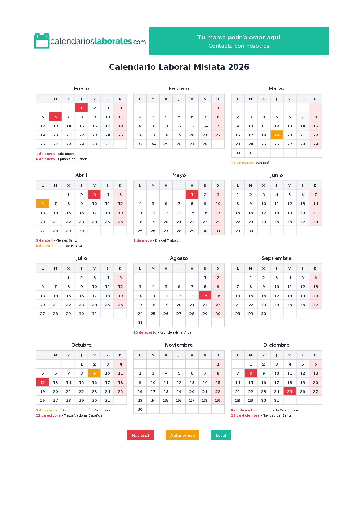 En 2026, 8 festivos nacionales se celebran en todo el territorio español, incluidos en el calendario laboral de Mislata.