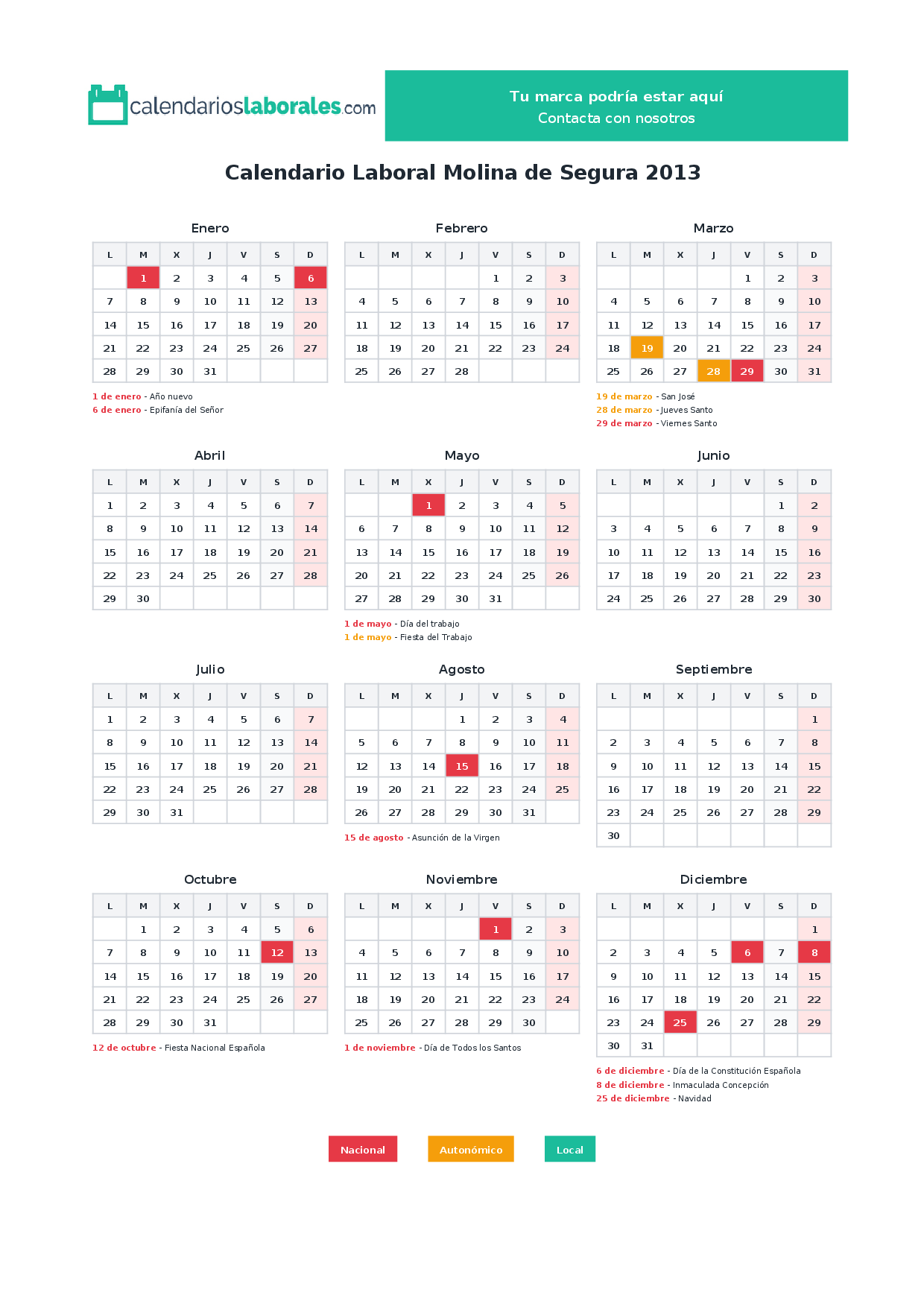 En 2013, 10 festivos nacionales se celebran en todo el territorio español, incluidos en el calendario laboral de Molina de Segura.