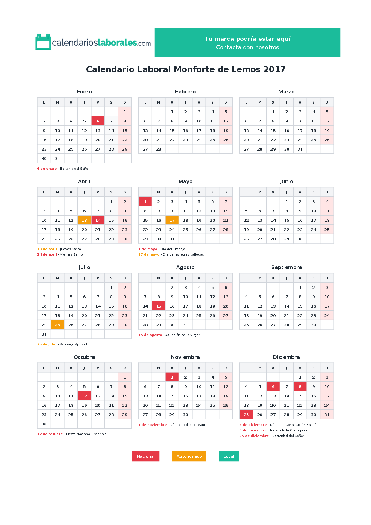 En 2017, 9 festivos nacionales se celebran en todo el territorio español, incluidos en el calendario laboral de Monforte de Lemos.