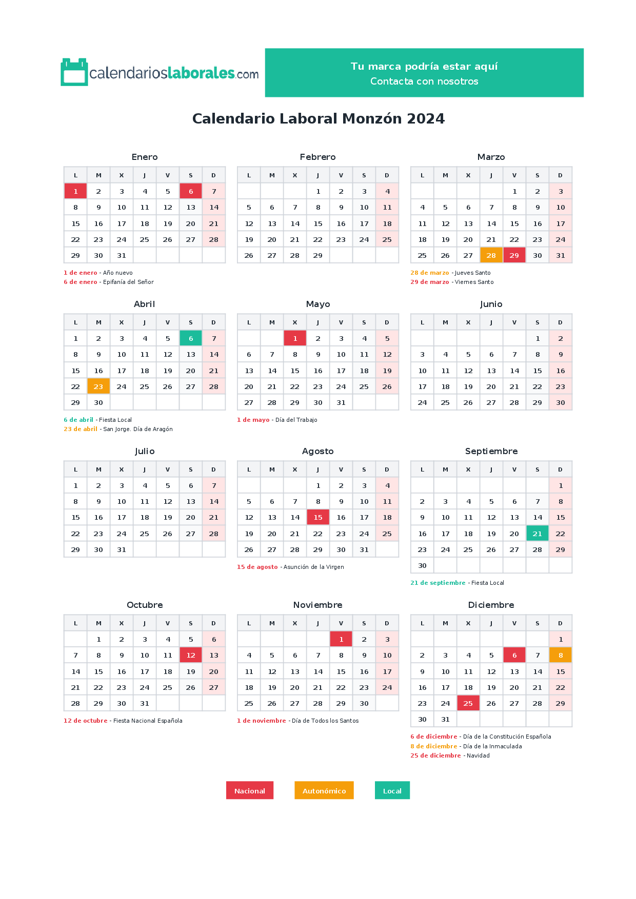 El calendario laboral de Monzón en 2024 incluye un total de 14 días festivos, que combinan festivos nacionales, festivos autonómicos de Aragón y los festivos locales propios del municipio.