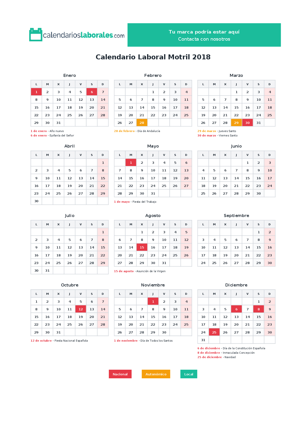 El calendario laboral de Motril en 2018 incluye un total de 12 días festivos, que combinan festivos nacionales, festivos autonómicos de Andalucía y los festivos locales propios del municipio.