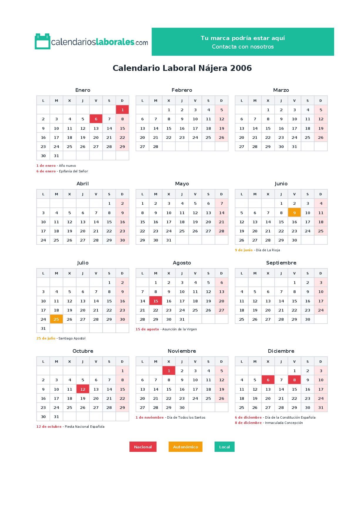 En 2006, 7 festivos nacionales se celebran en todo el territorio español, incluidos en el calendario laboral de Nájera.