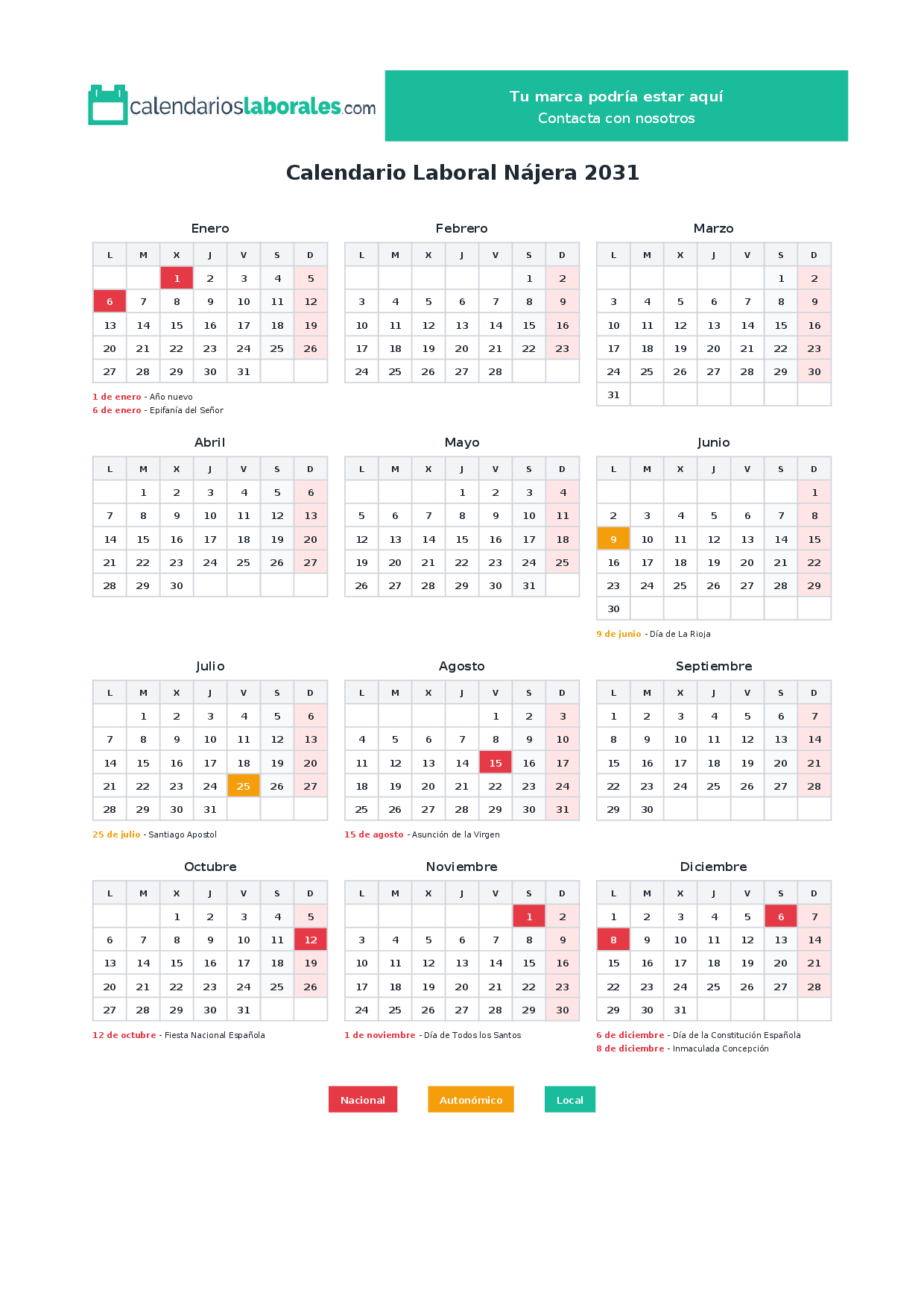 Calendario laboral Nájera 2031