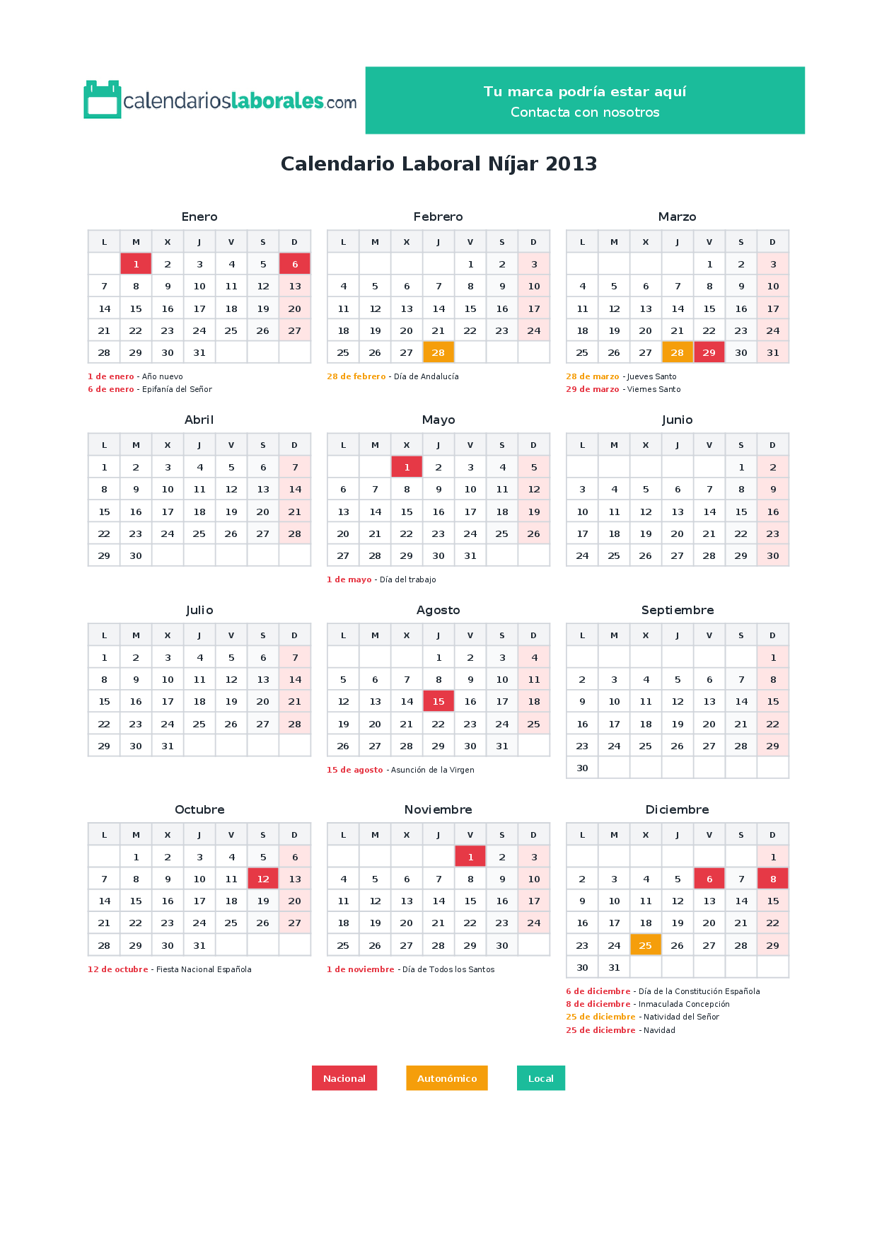 En 2013, 10 festivos nacionales se celebran en todo el territorio español, incluidos en el calendario laboral de Níjar.