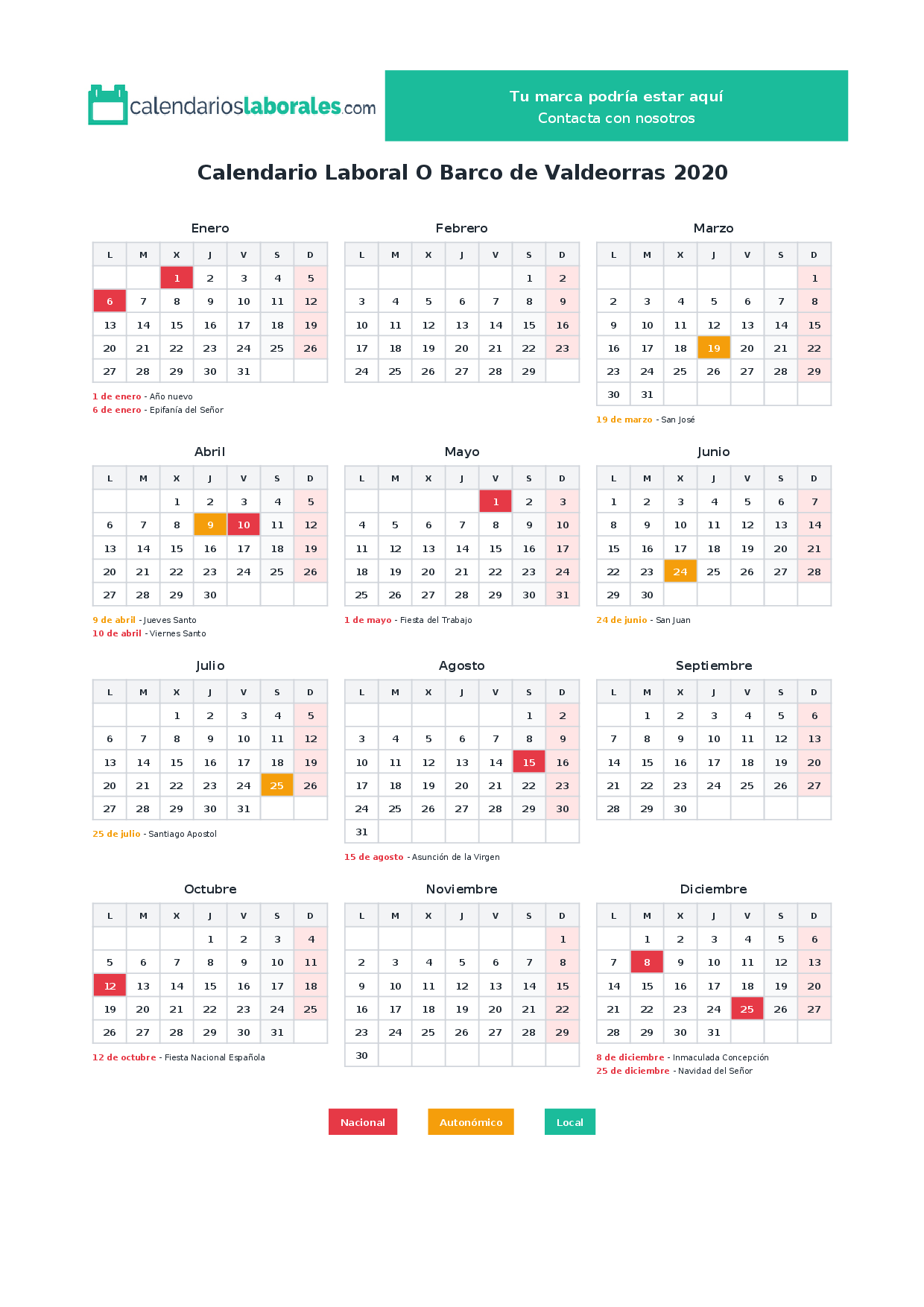 El calendario laboral de O Barco de Valdeorras en 2020 incluye un total de 12 días festivos, que combinan festivos nacionales, festivos autonómicos de Galicia y los festivos locales propios del municipio.