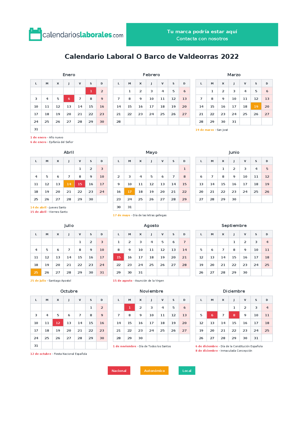 En 2022, 8 festivos nacionales se celebran en todo el territorio español, incluidos en el calendario laboral de O Barco de Valdeorras.
