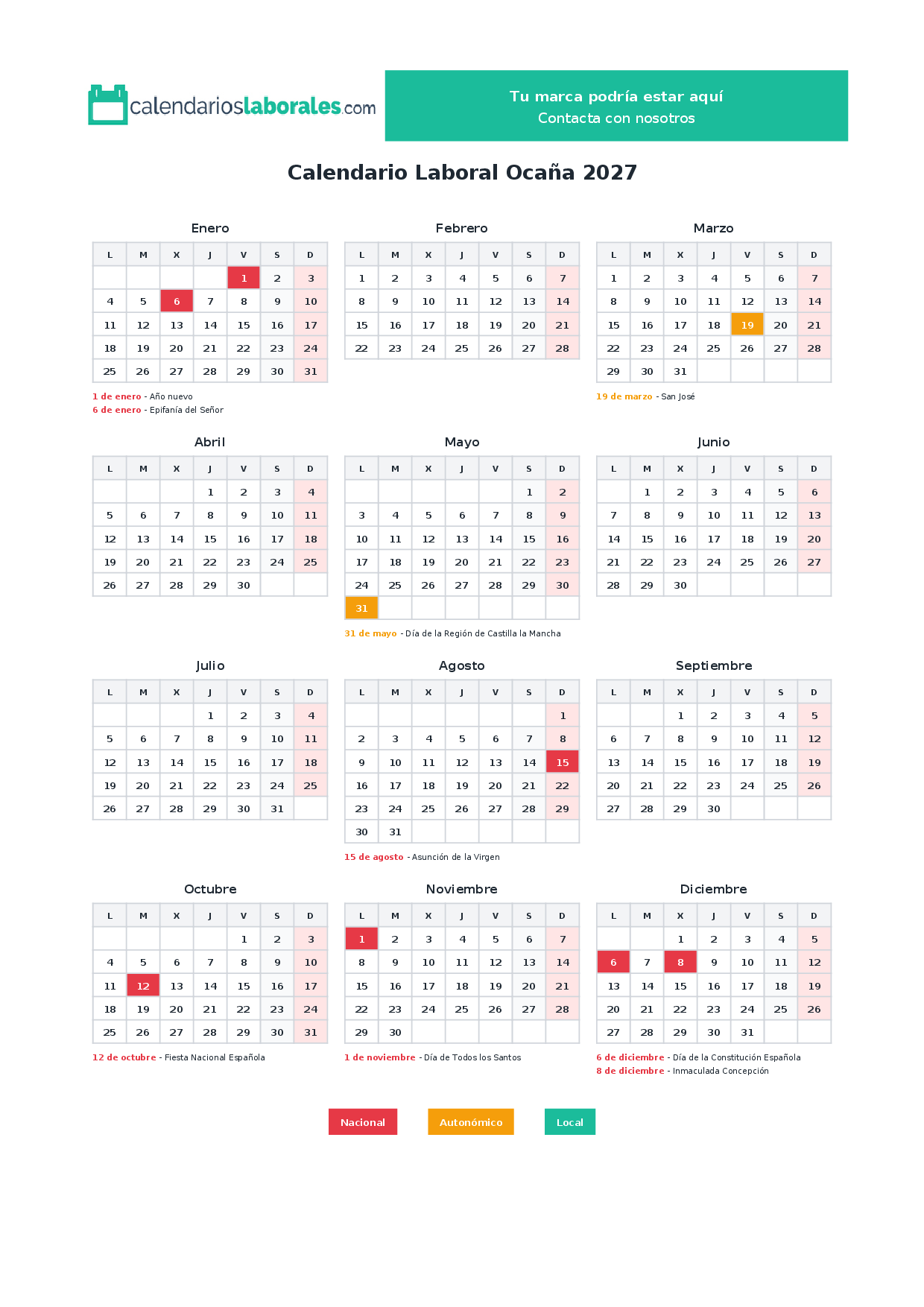 Calendario laboral Ocaña 2027