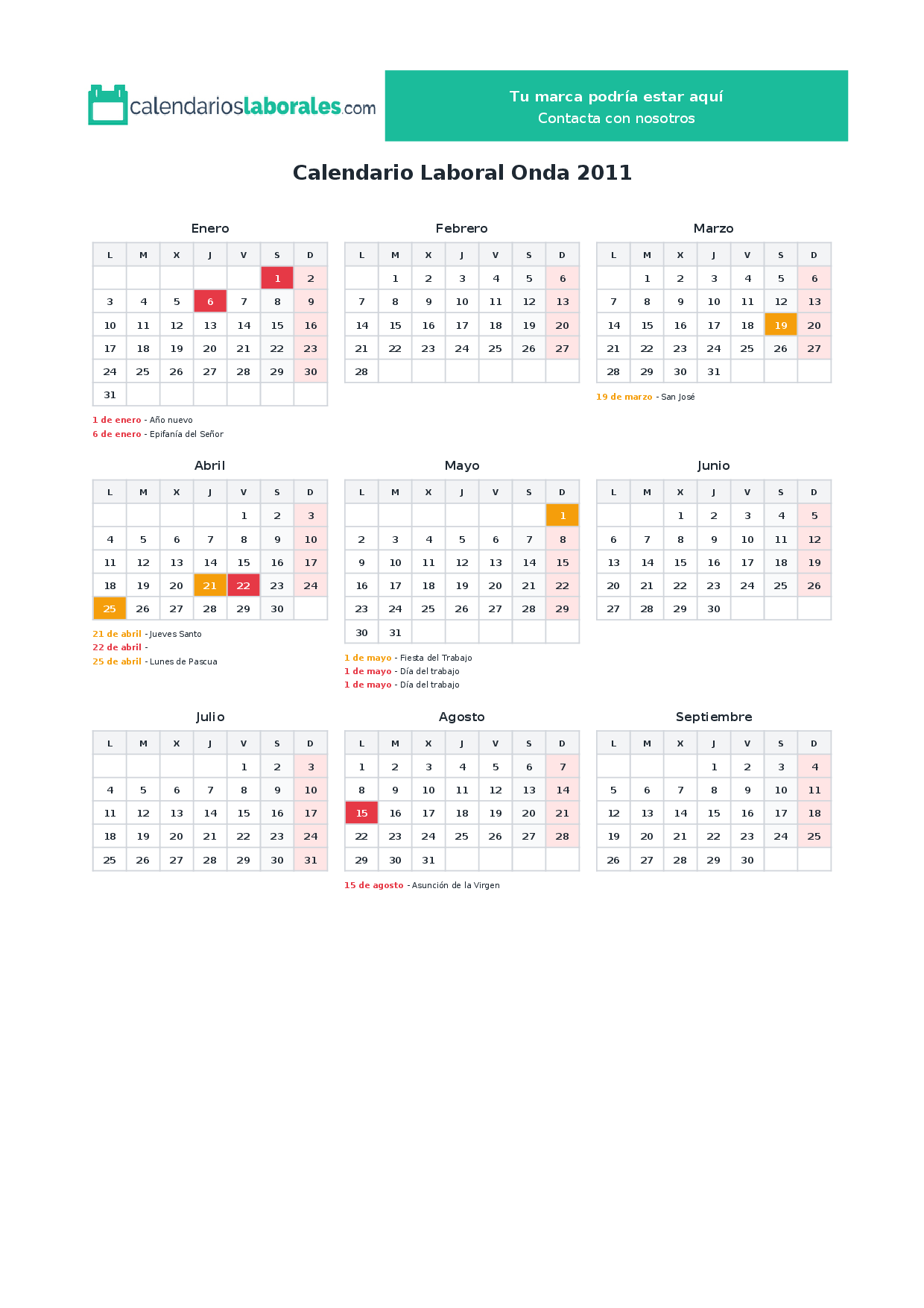 En 2011, 21 festivos nacionales se celebran en todo el territorio español, incluidos en el calendario laboral de Onda.