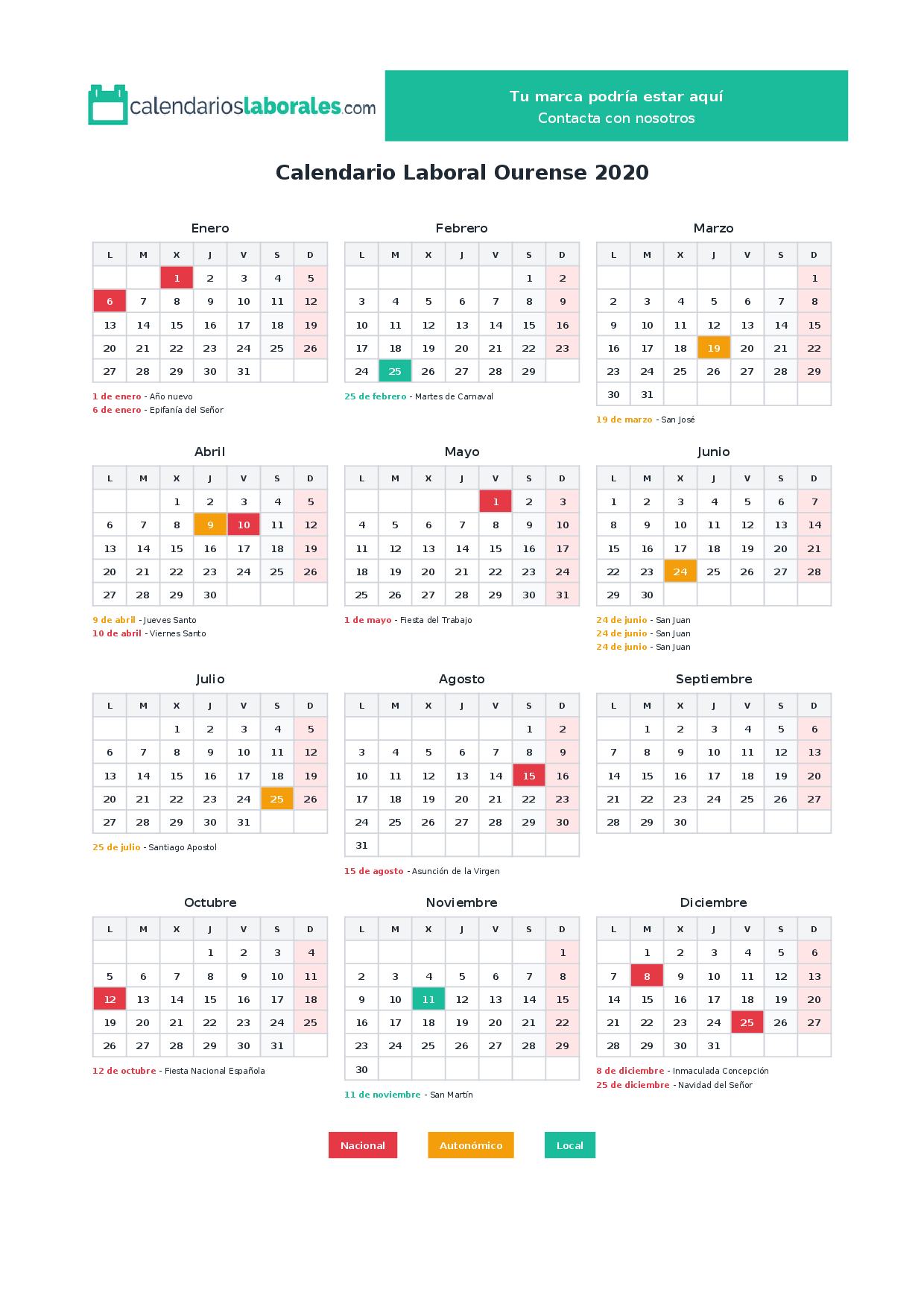 El calendario laboral de Ourense en 2020 cuenta con un total de 14 días festivos, que incluyen festivos nacionales, festivos autonómicos de Galicia y los festivos locales establecidos por cada municipio.