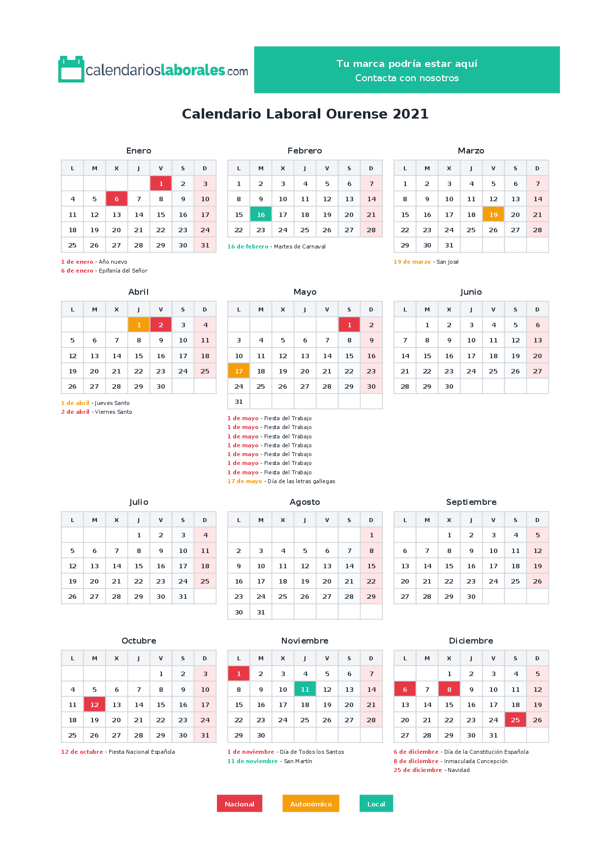El calendario laboral de Ourense en 2021 cuenta con un total de 14 días festivos, que incluyen festivos nacionales, festivos autonómicos de Galicia y los festivos locales establecidos por cada municipio.
