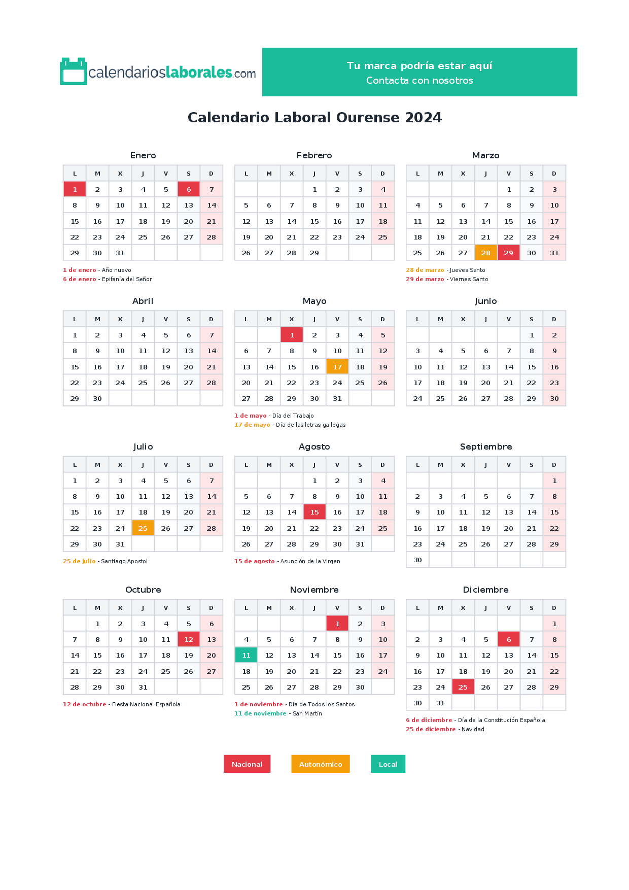 El calendario laboral de Ourense en 2024 cuenta con un total de 13 días festivos, que incluyen festivos nacionales, festivos autonómicos de Galicia y los festivos locales establecidos por cada municipio.