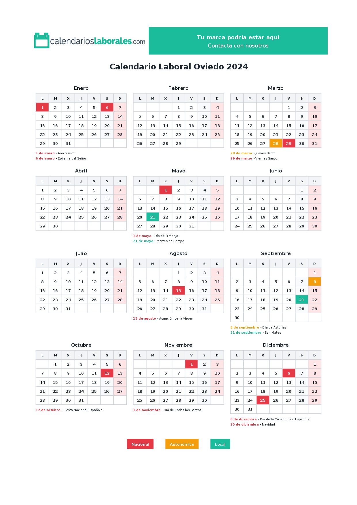 El calendario laboral de Oviedo en 2024 incluye un total de 13 días festivos, que combinan festivos nacionales, festivos autonómicos de Asturias y los festivos locales propios del municipio.