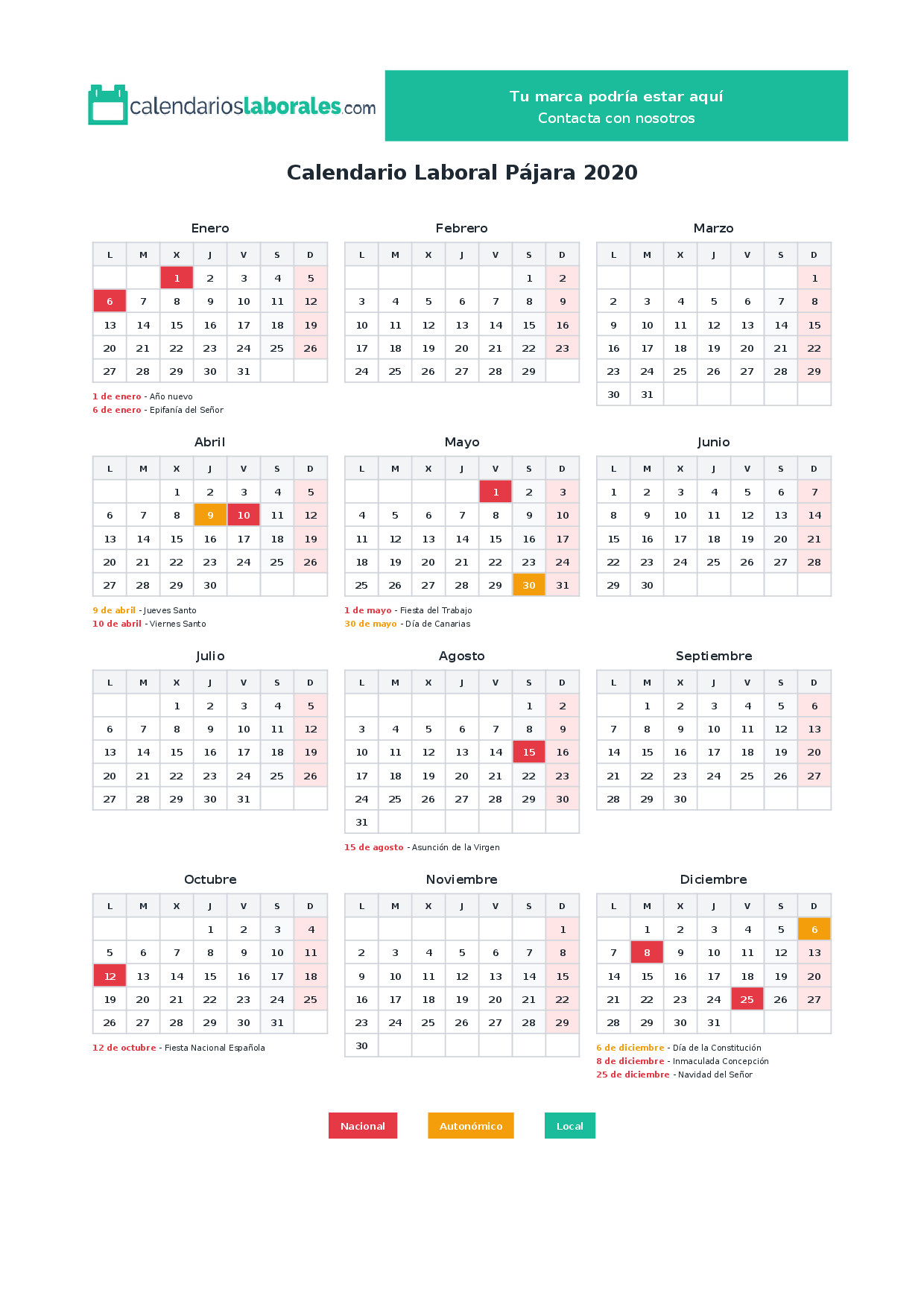 En 2020, 8 festivos nacionales se celebran en todo el territorio español, incluidos en el calendario laboral de Pájara.