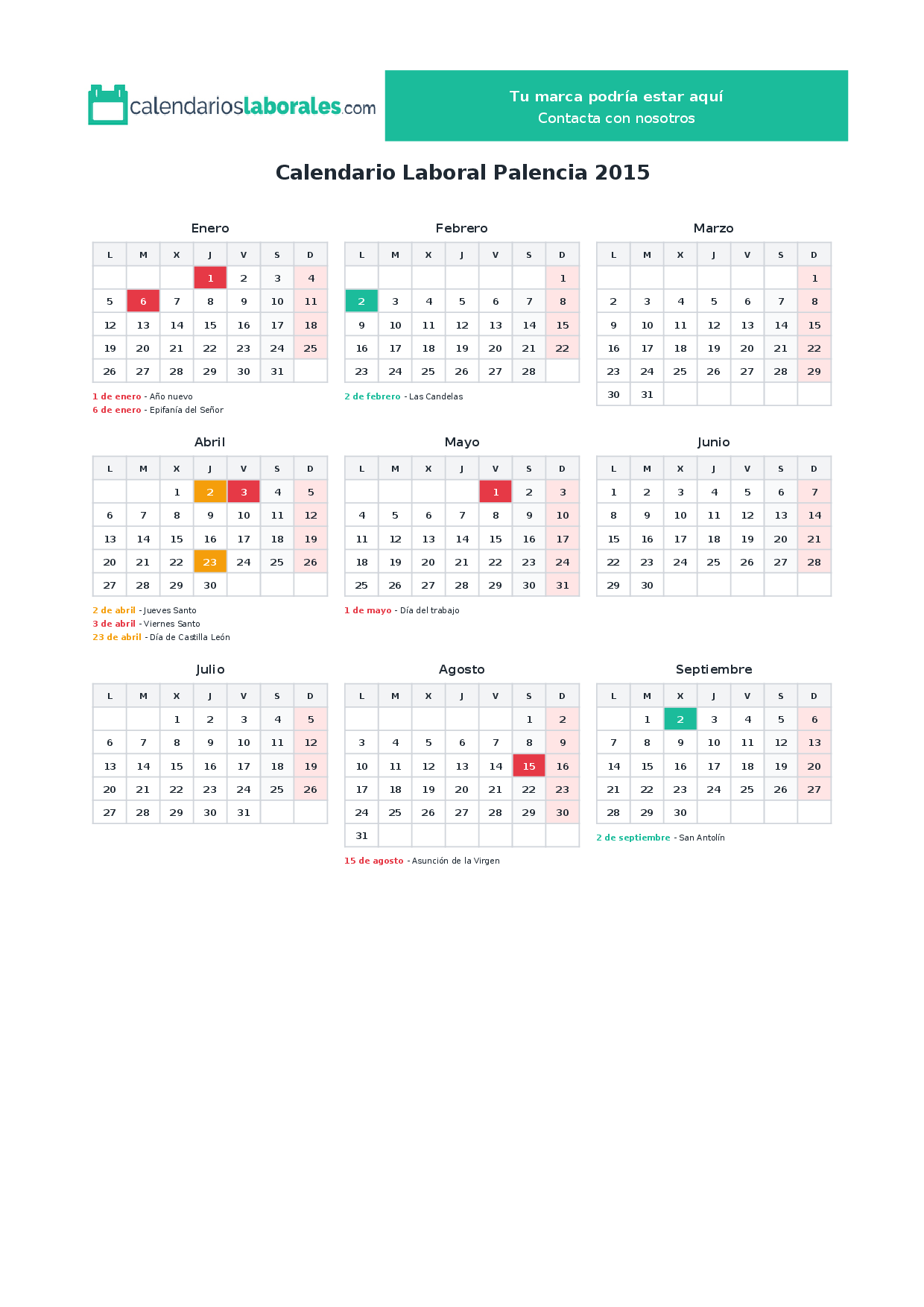 El calendario laboral de Palencia en 2015 cuenta con un total de 14 días festivos, que incluyen festivos nacionales, festivos autonómicos de Castilla León y los festivos locales establecidos por cada municipio.