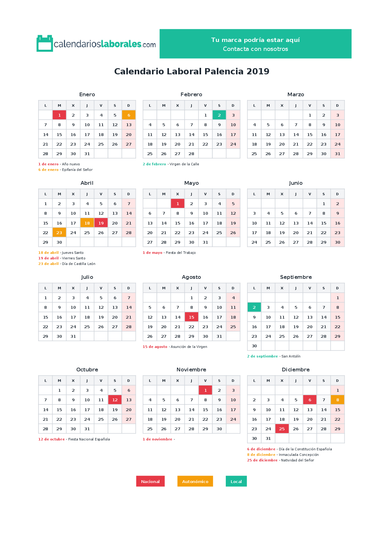 El calendario laboral de Palencia en 2019 cuenta con un total de 14 días festivos, que incluyen festivos nacionales, festivos autonómicos de Castilla León y los festivos locales establecidos por cada municipio.