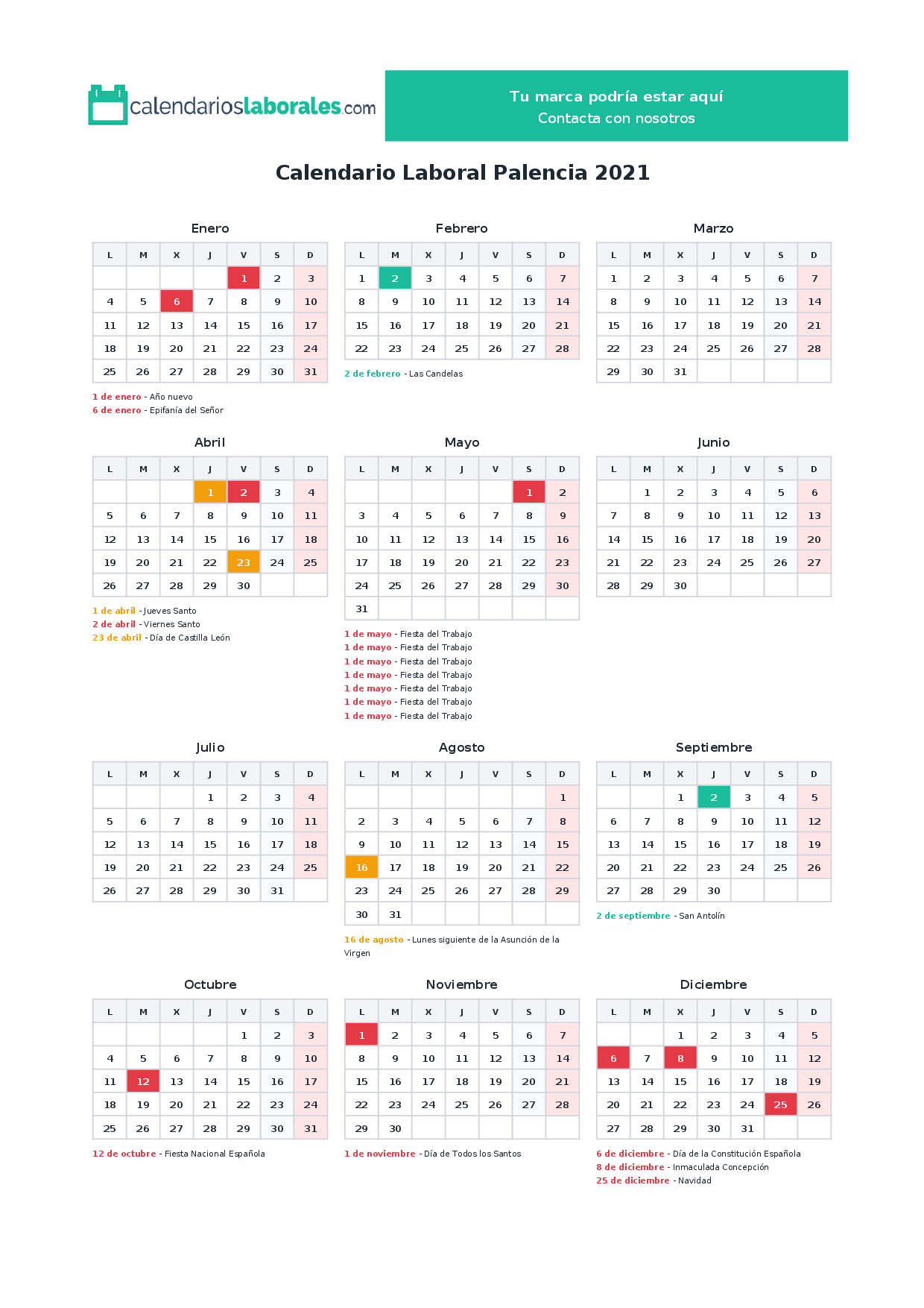 El calendario laboral de Palencia en 2021 cuenta con un total de 14 días festivos, que incluyen festivos nacionales, festivos autonómicos de Castilla León y los festivos locales establecidos por cada municipio.