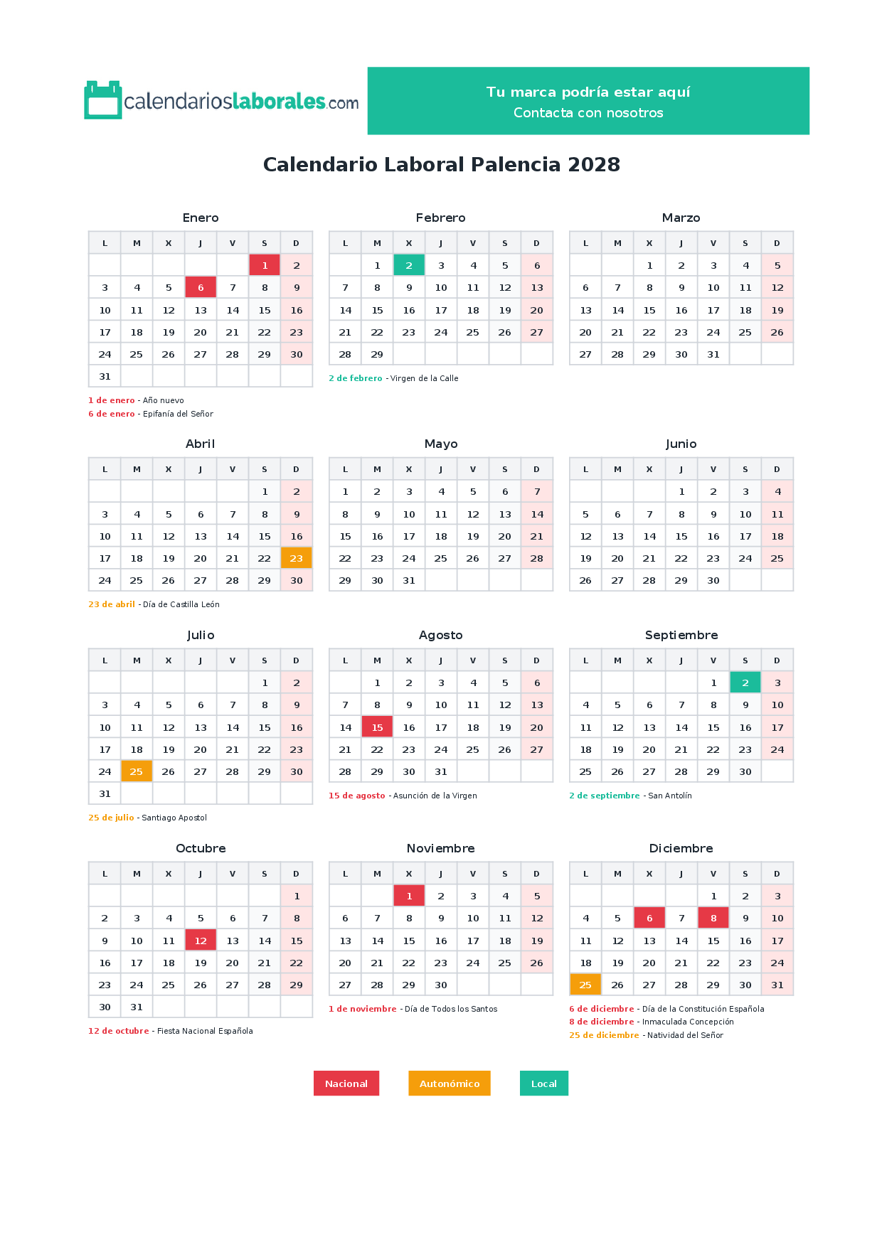 El calendario laboral de Palencia en 2028 cuenta con un total de 12 días festivos, que incluyen festivos nacionales, festivos autonómicos de Castilla León y los festivos locales establecidos por cada municipio.