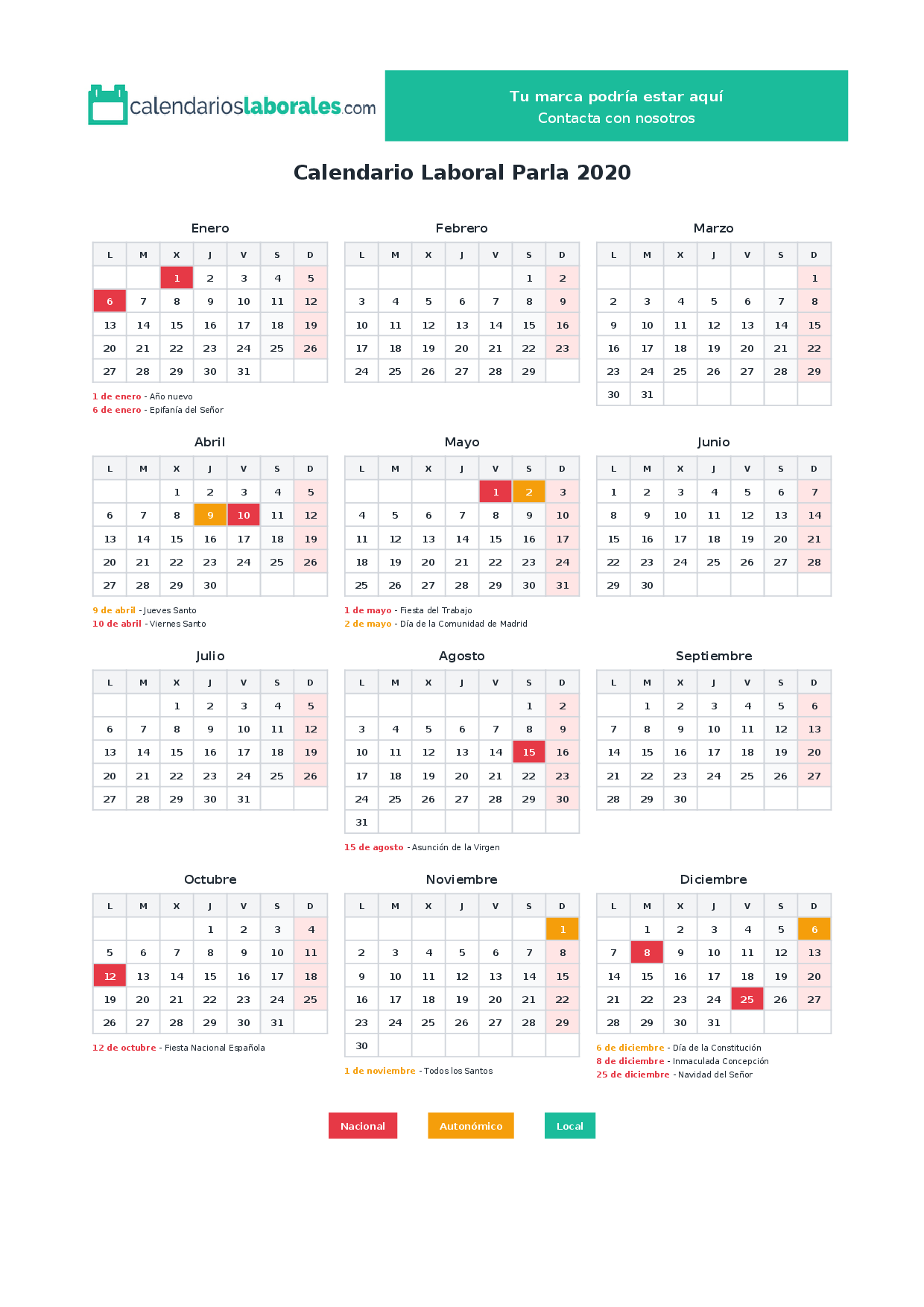 El calendario laboral de Parla en 2020 incluye un total de 12 días festivos, que combinan festivos nacionales, festivos autonómicos de Comunidad de Madrid y los festivos locales propios del municipio.
