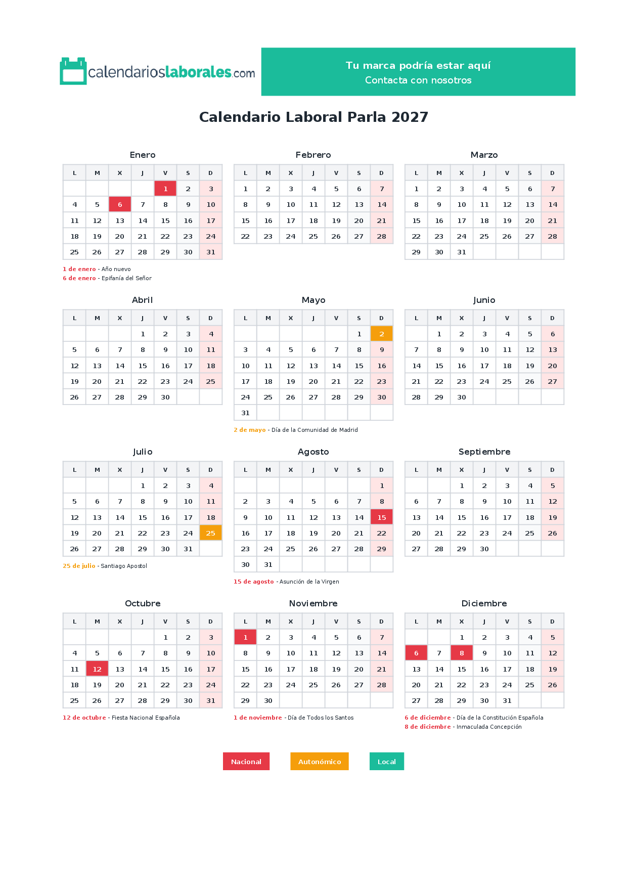 El calendario laboral de Parla en 2027 incluye un total de 9 días festivos, que combinan festivos nacionales, festivos autonómicos de Comunidad de Madrid y los festivos locales propios del municipio.