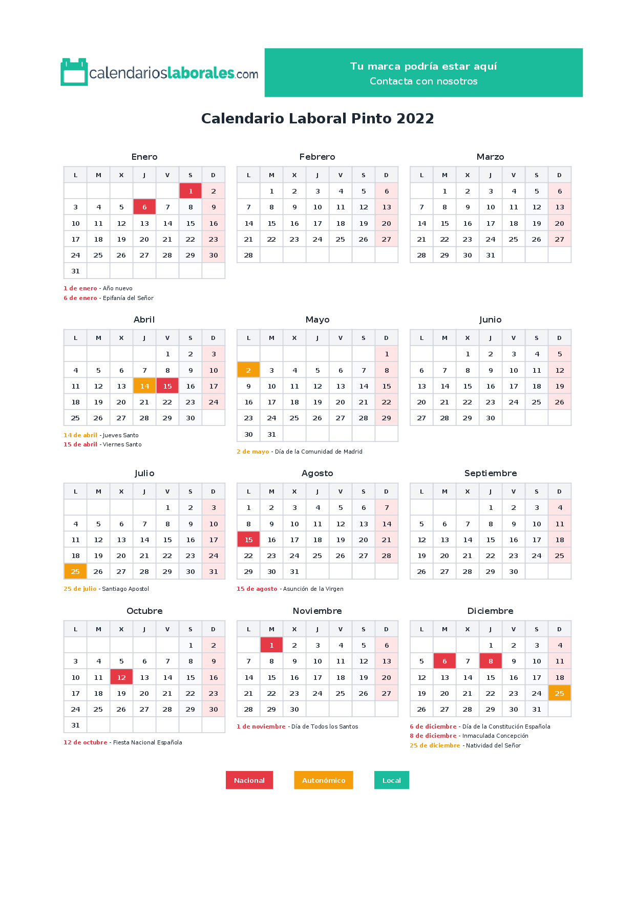 El calendario laboral de Pinto en 2022 incluye un total de 12 días festivos, que combinan festivos nacionales, festivos autonómicos de Comunidad de Madrid y los festivos locales propios del municipio.