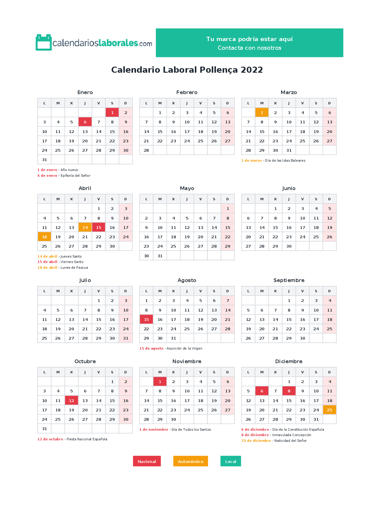 El calendario laboral de Pollença en 2022 incluye un total de 12 días festivos, que combinan festivos nacionales, festivos autonómicos de Baleares y los festivos locales propios del municipio.