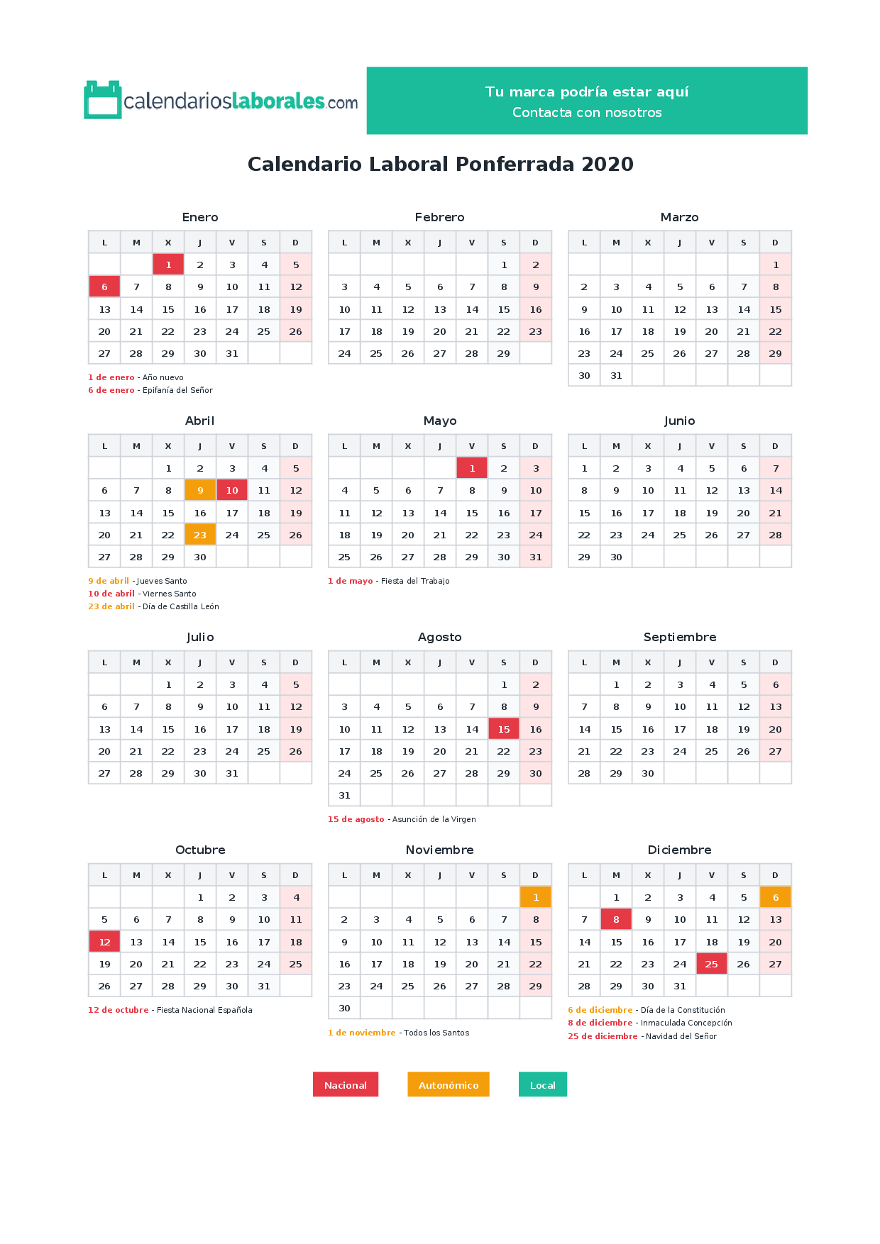 Calendario laboral Ponferrada 2020