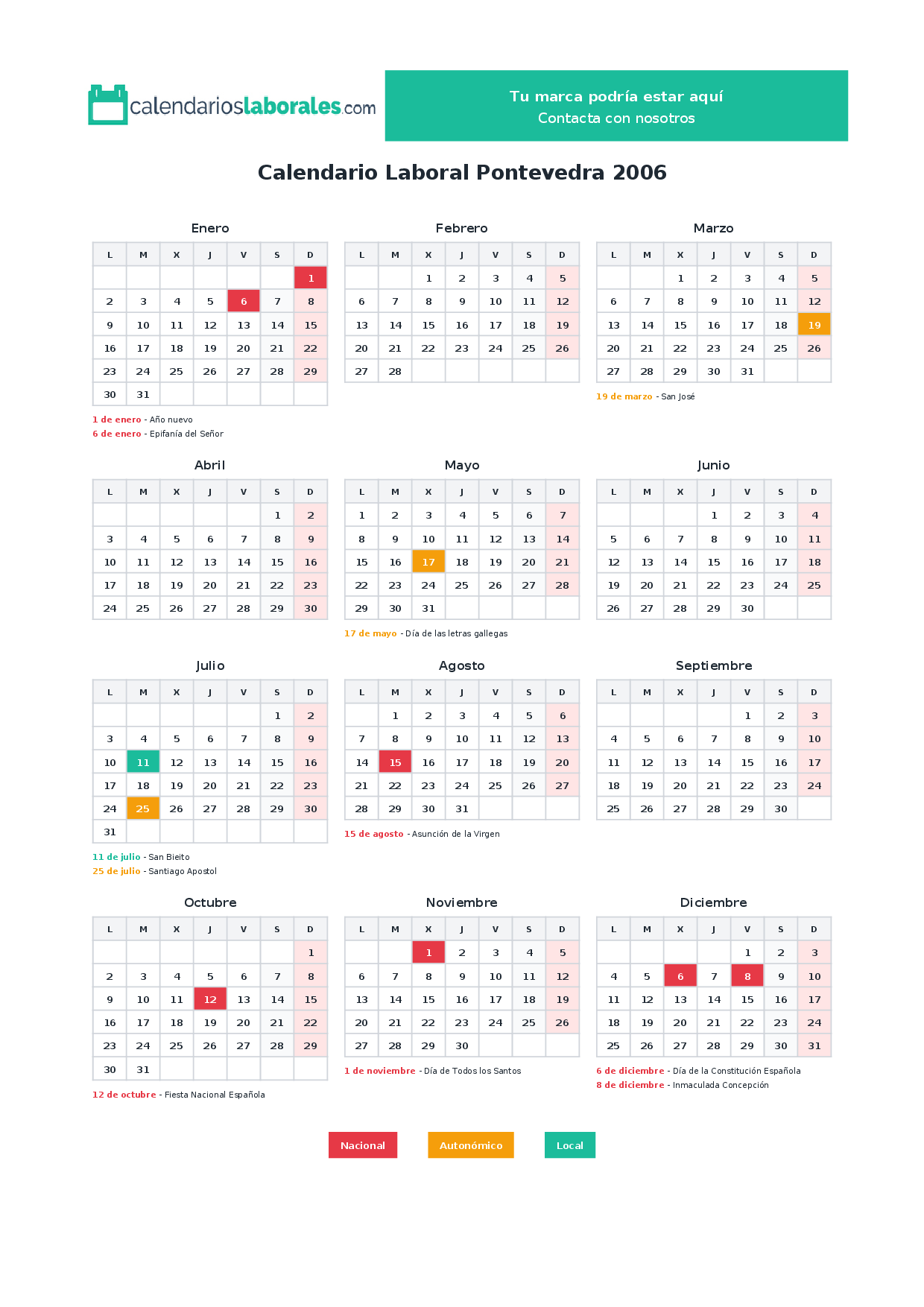 El calendario laboral de Pontevedra en 2006 cuenta con un total de 11 días festivos, que incluyen festivos nacionales, festivos autonómicos de Galicia y los festivos locales establecidos por cada municipio.